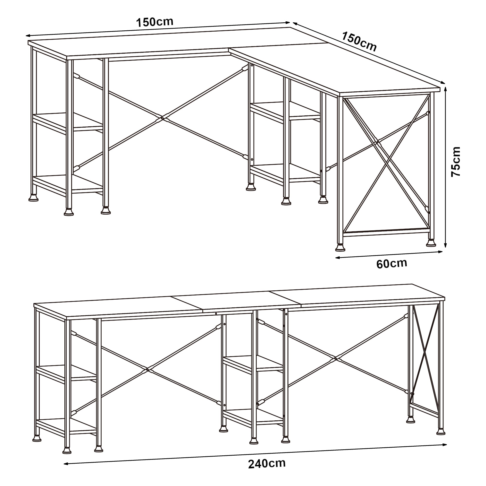 - Biurko w wersji prostej: 240 x 60 x 75 cm