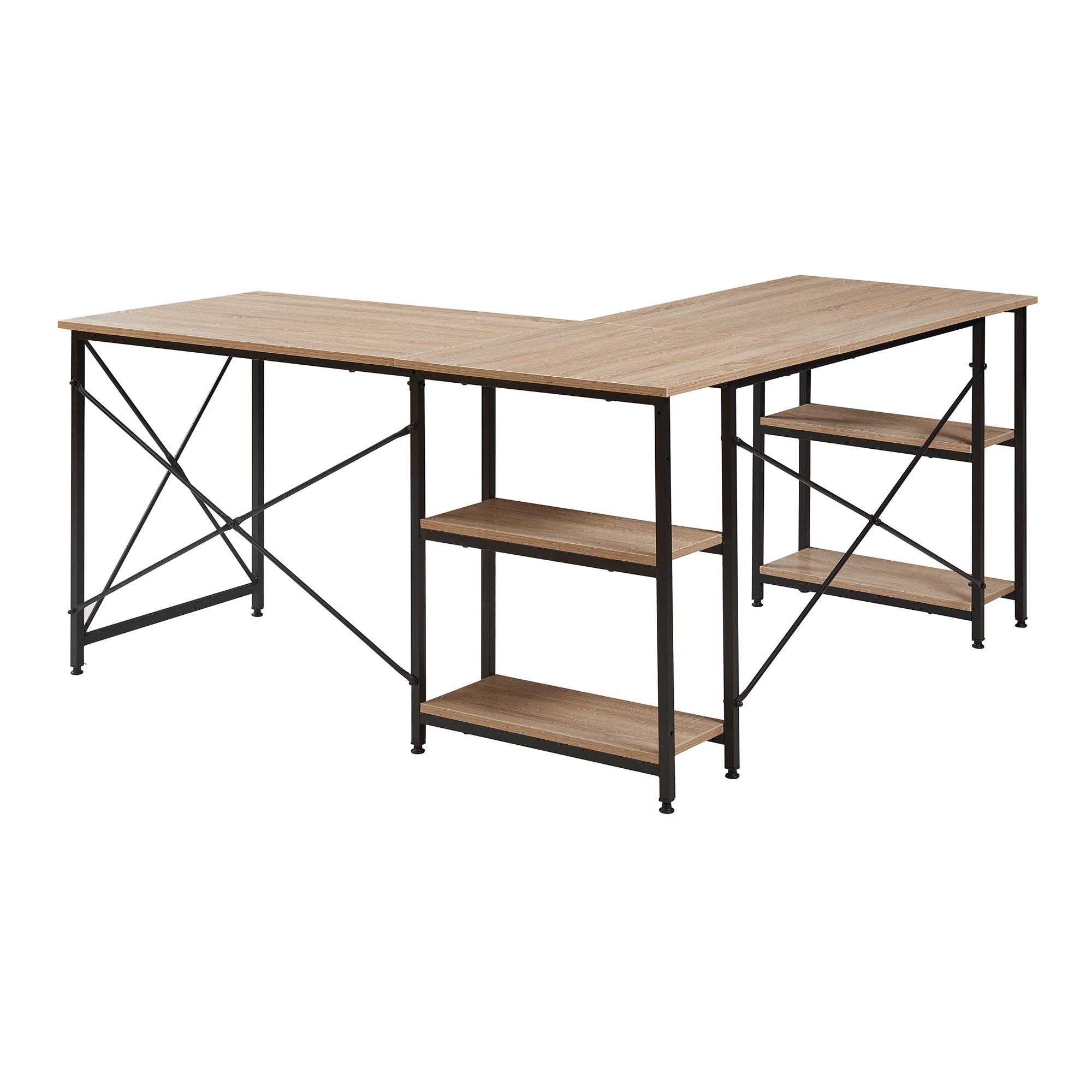 Biurko można zamontować nie tylko w kształcie litery L, ale także jako prosty, ciągły stanowisko pracy. Posiada dwa wbudowane regały, z których każdy ma po dwie otwarte półki. Półki oferują dużo miejsca do przechowywania książek, dokumentów, materiałów biurowych i dekoracji, dzięki czemu wszystko ma swoje miejsce i jest zawsze pod ręką.