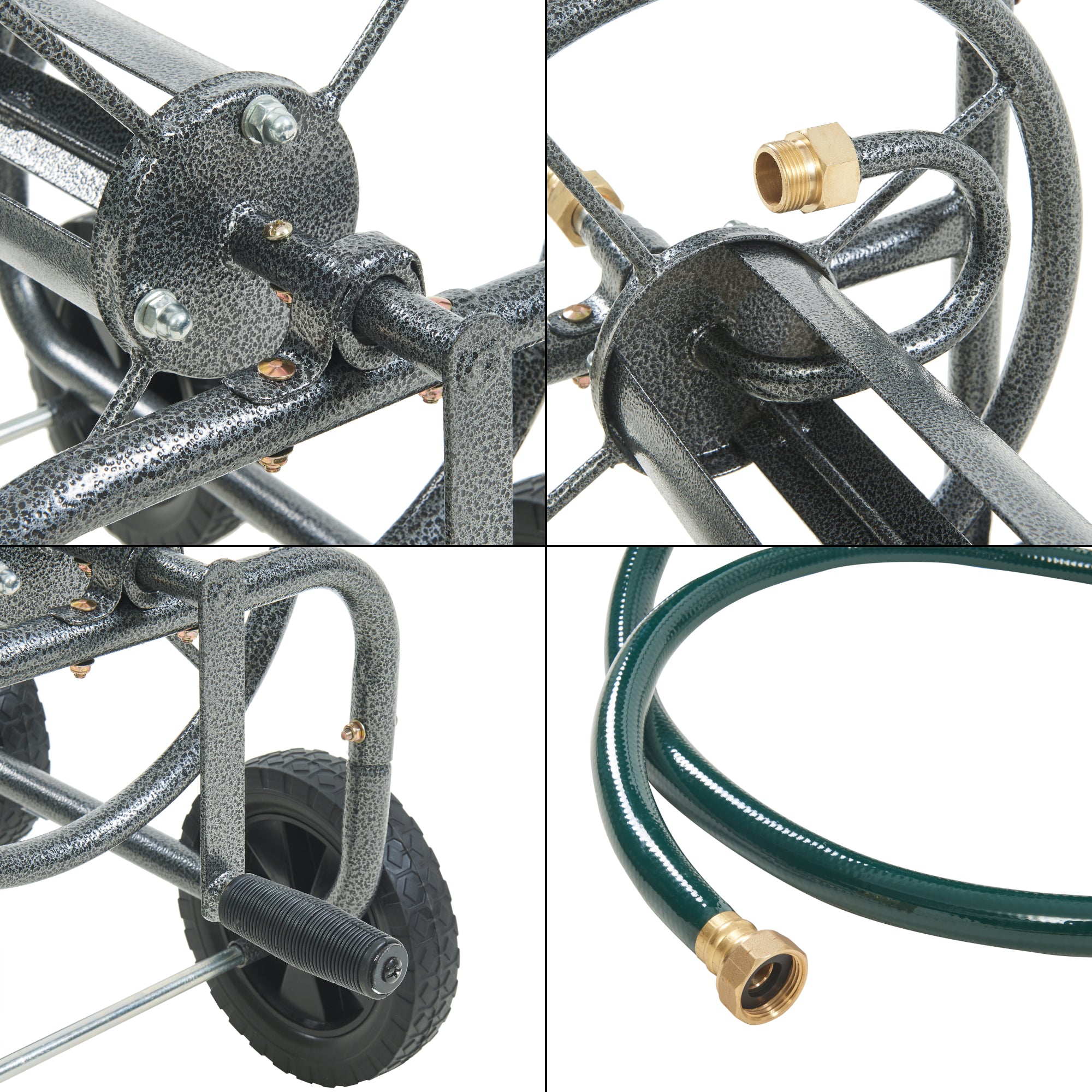 Wyposażony w wąż zasilający o długości 1,5 m, w tym złącze 3/4 cala do kranu i obrotowe złącze mosiężne 90 ° na bębnie, wózek umożliwia wygodne podłączenie węża wodnego 3/4 cala. Dzięki obrotowemu połączeniu przepływ wody pozostaje stały podczas rozwijania węża, a skręcenia i załamania są zapobiegane.