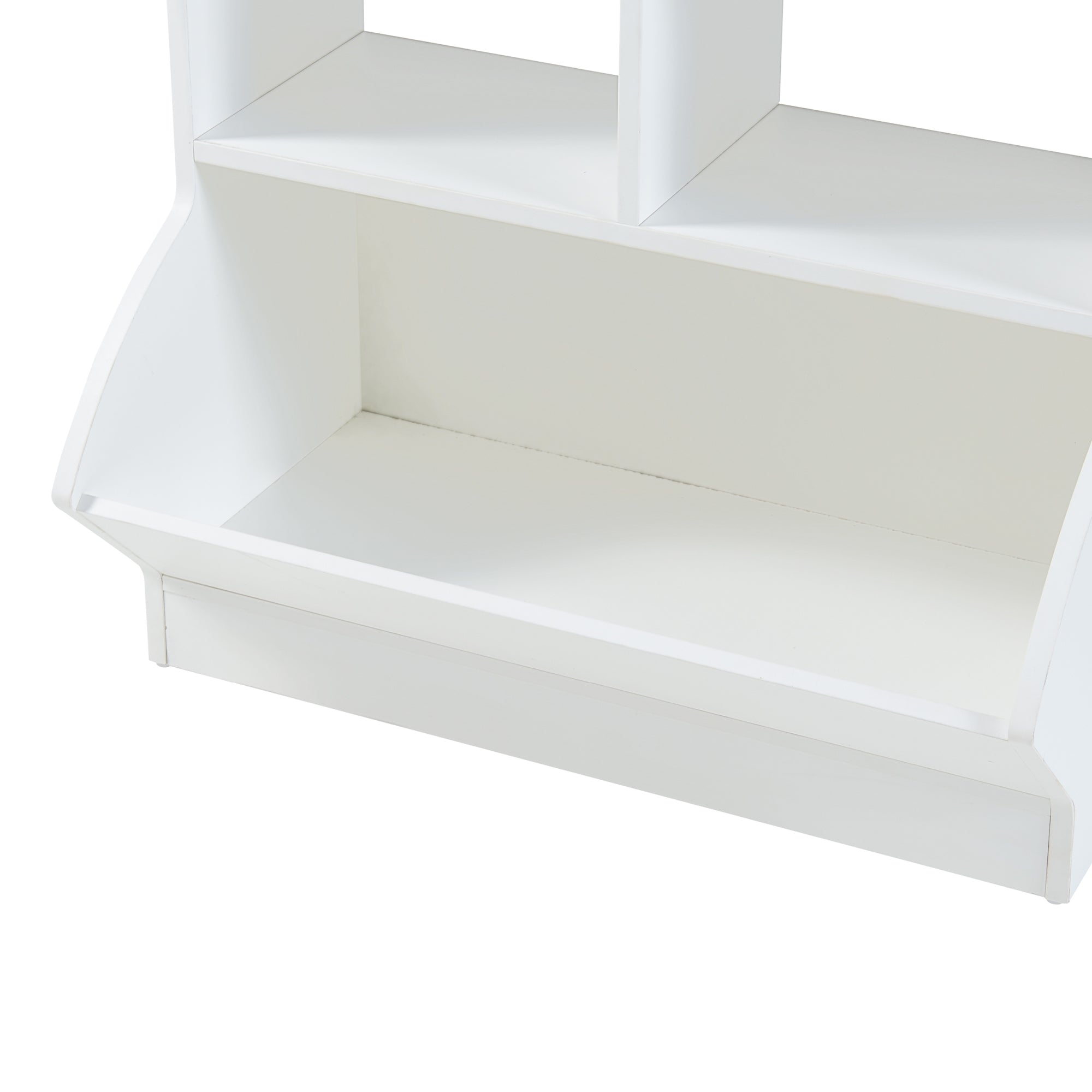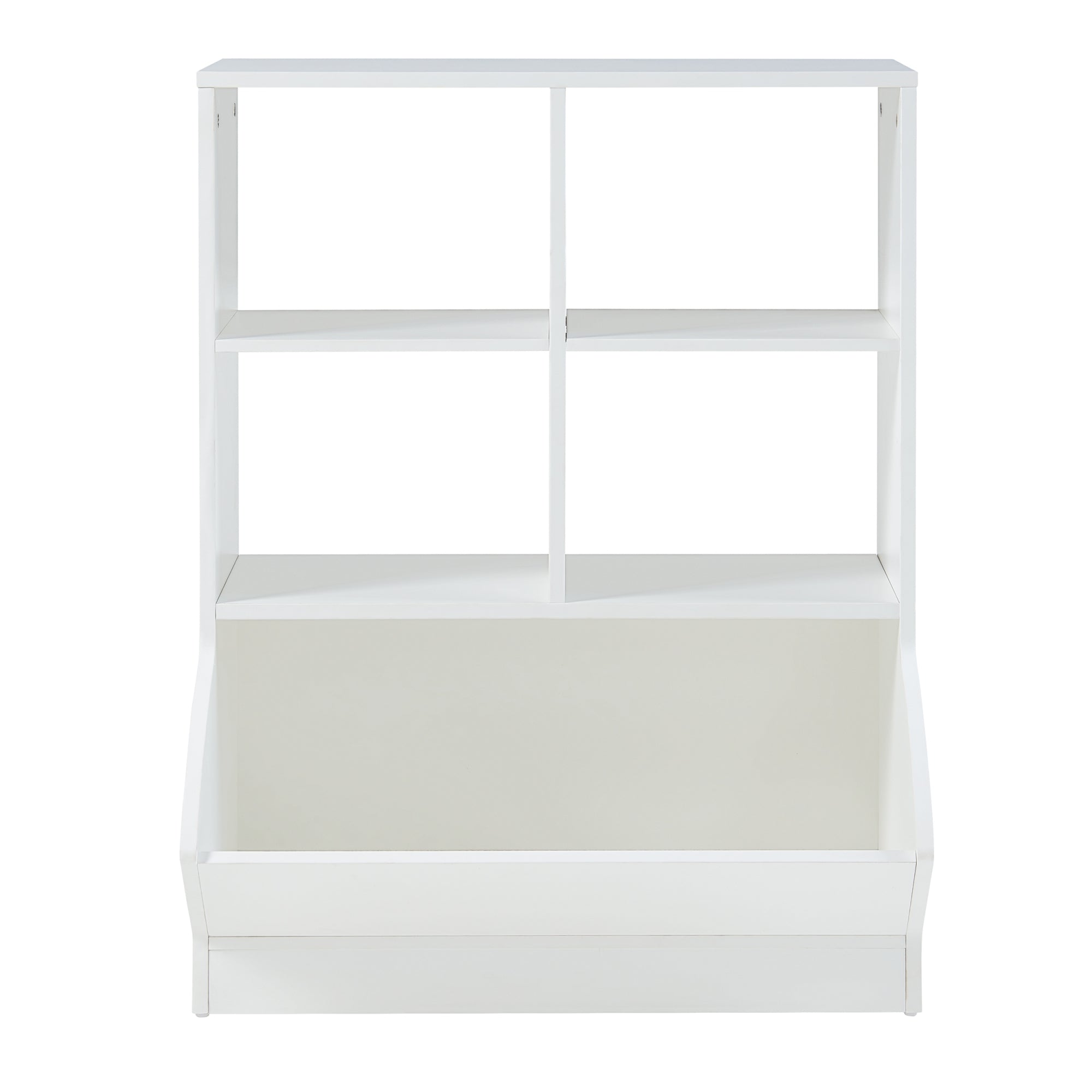Cztery otwarte półki oferują mnóstwo miejsca na książki, przedmioty dekoracyjne i zabawki, a duża dolna półka zapewnia dodatkową przestrzeń do przechowywania większych przedmiotów.
