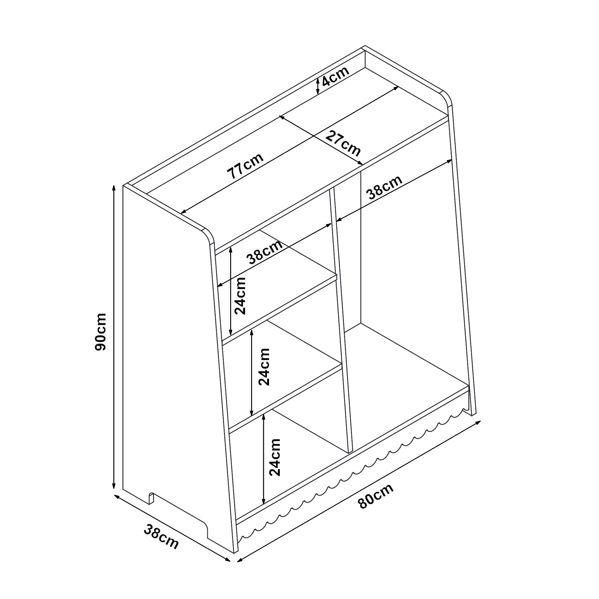 - Otwarte schowki (wys. x szer.): 24 x 38 cm każdy
