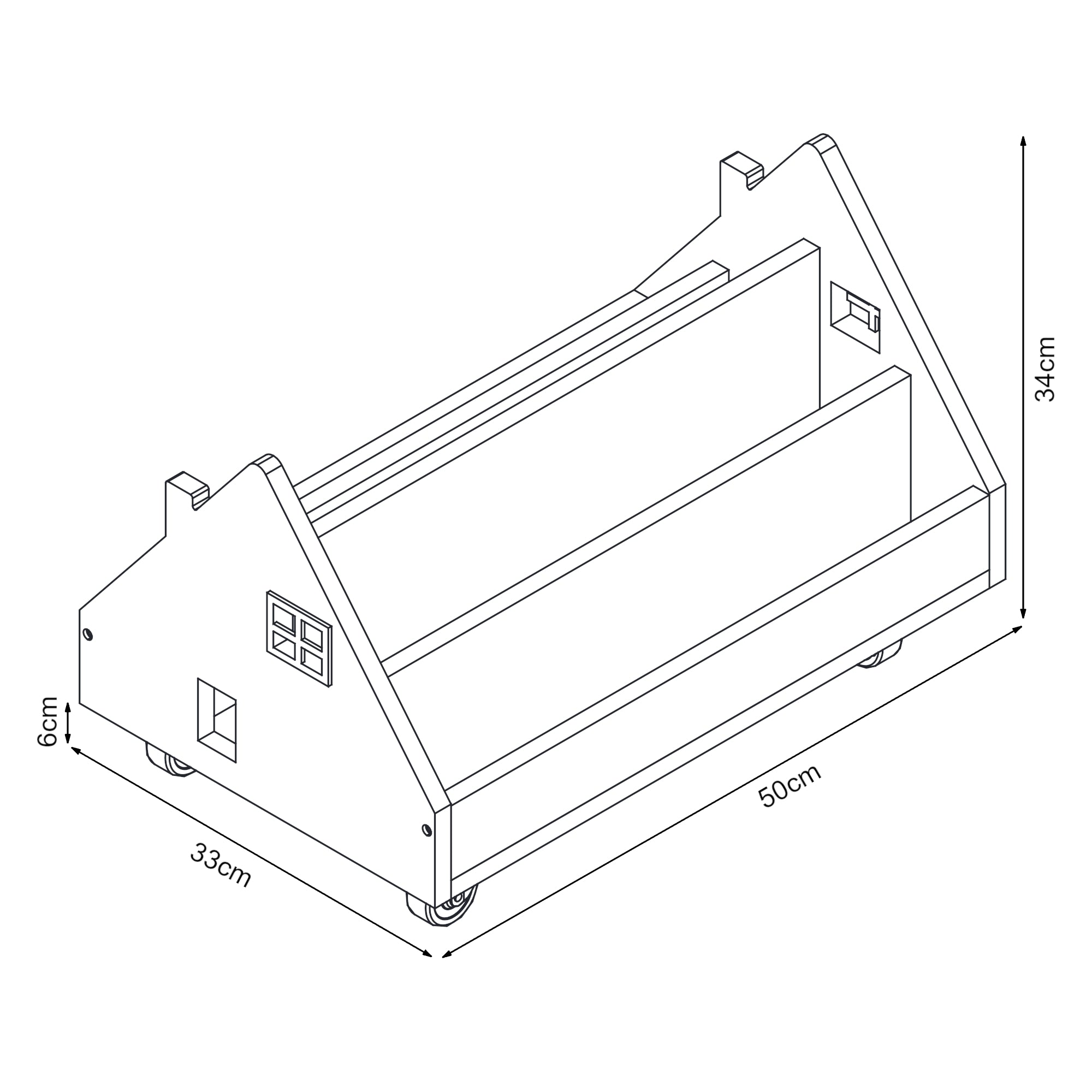 Mobilna półka dla dzieci ma cztery kółka i oferuje mnóstwo miejsca na dziecięce skarby dzięki dwóm otwartym schowkom po każdej stronie. Dekoracyjny wygląd domku sprawia, że przyciąga wzrok w każdym dziecięcym pokoju