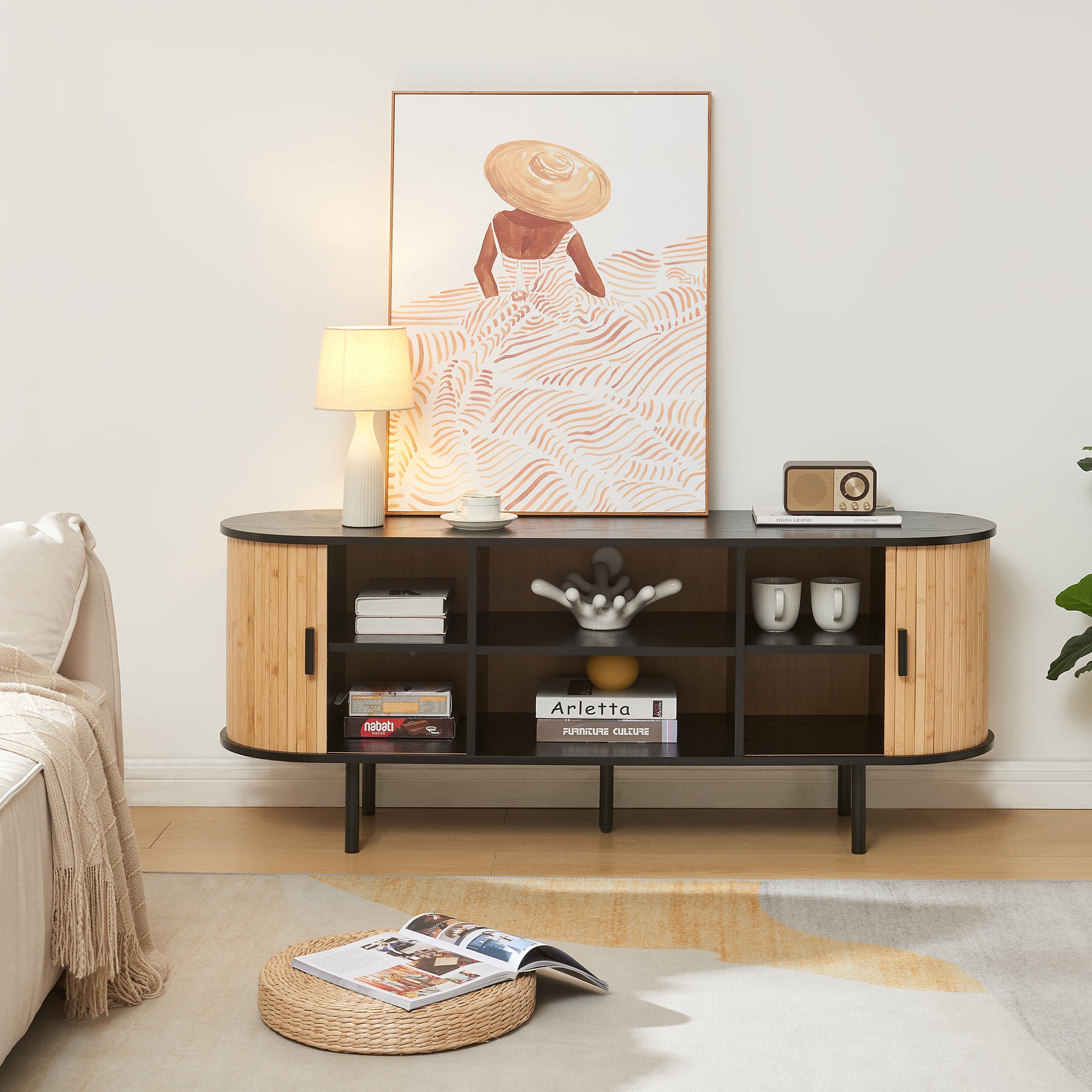 Dodatkowo, stół posiada dwoje przesuwanych drzwi, które można otworzyć bez wysiłku. Wewnątrz szafki znajduje się mnóstwo miejsca do bezpiecznego przechowywania płyt DVD, Blu-ray lub gier na konsolę. Dzięki temu wszystko jest łatwo dostępne i uporządkowane.
