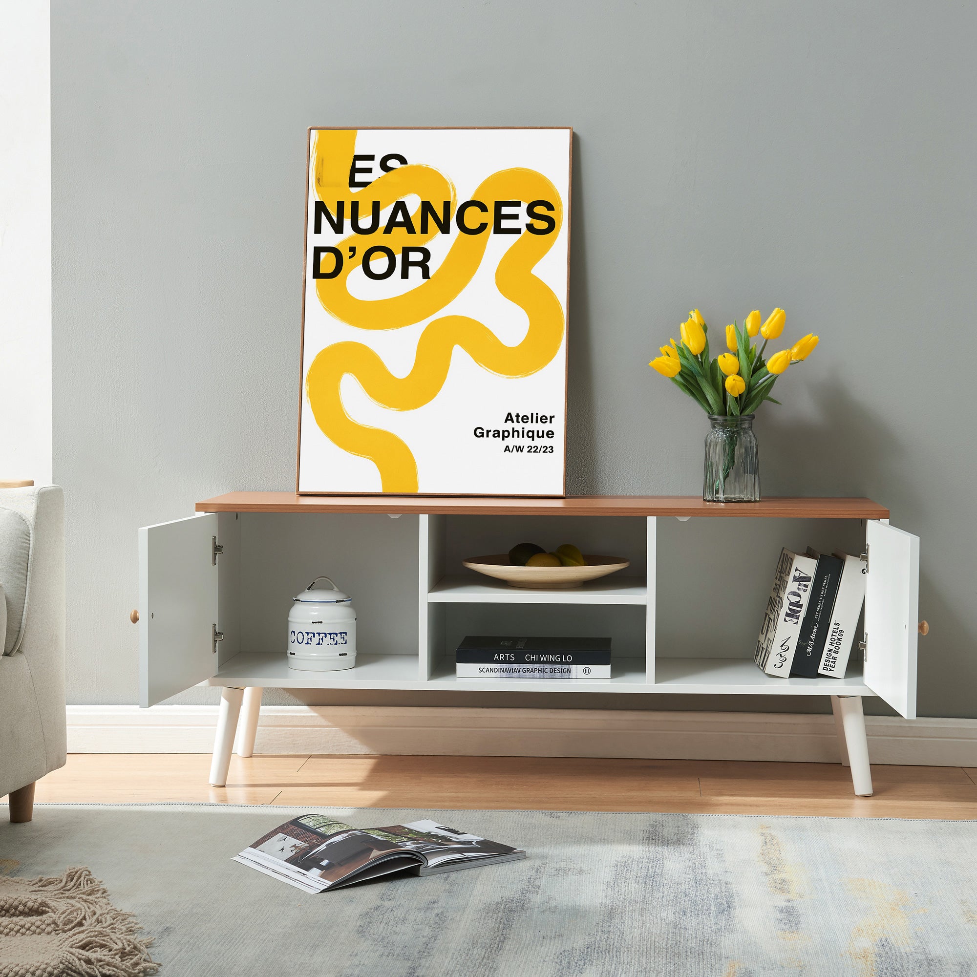 Pojemna powierzchnia do przechowywania szafki dolnej oferuje wystarczająco dużo miejsca na telewizor. Pod spodem znajdują się dwie otwarte przegrody, które są idealne do przechowywania urządzeń multimedialnych, takich jak odtwarzacze DVD lub konsole do gier.