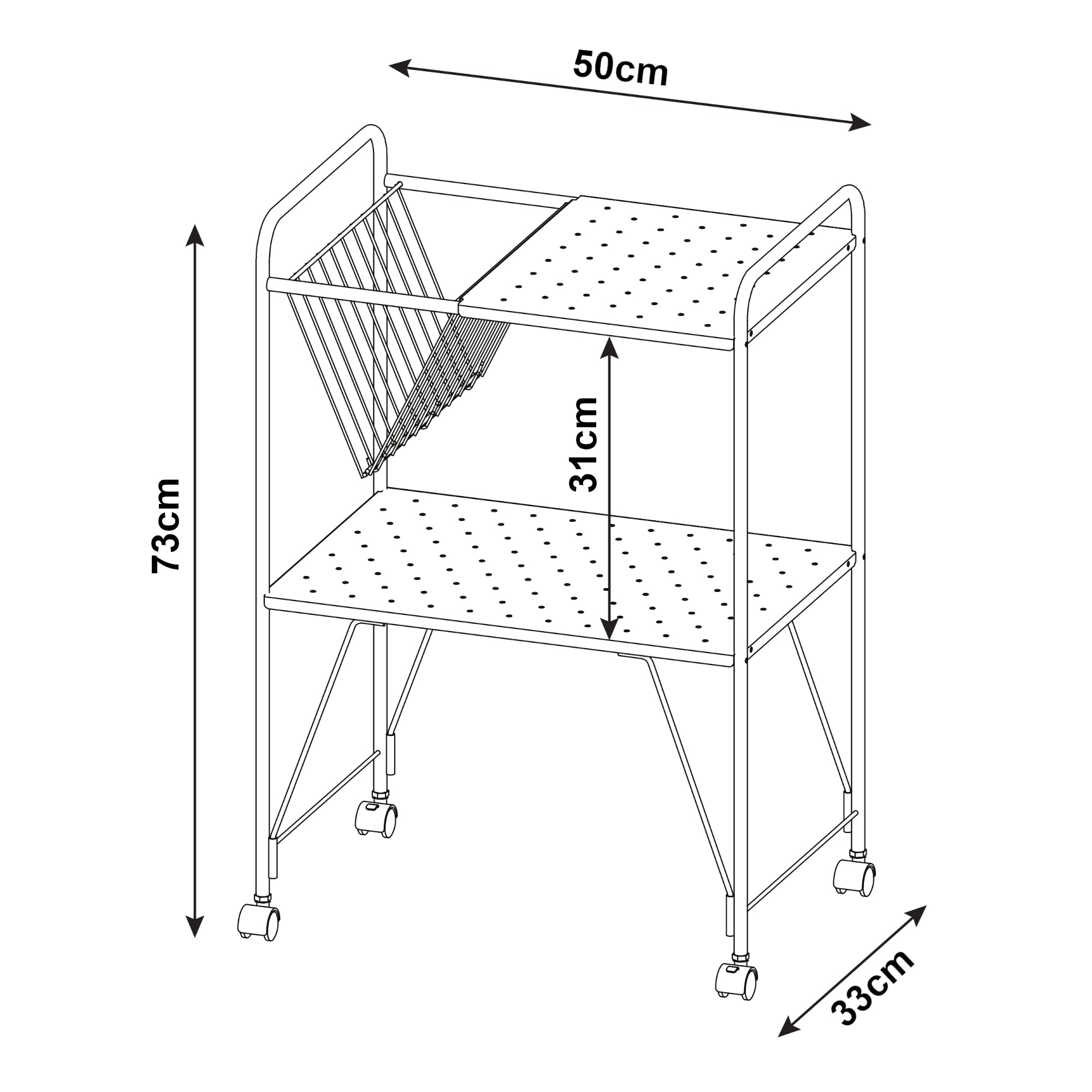 Dodatkowo, wózek posiada specjalny kosz na gazety, który pozwala na schludne przechowywanie gazet, czasopism lub innych artykułów papierniczych.