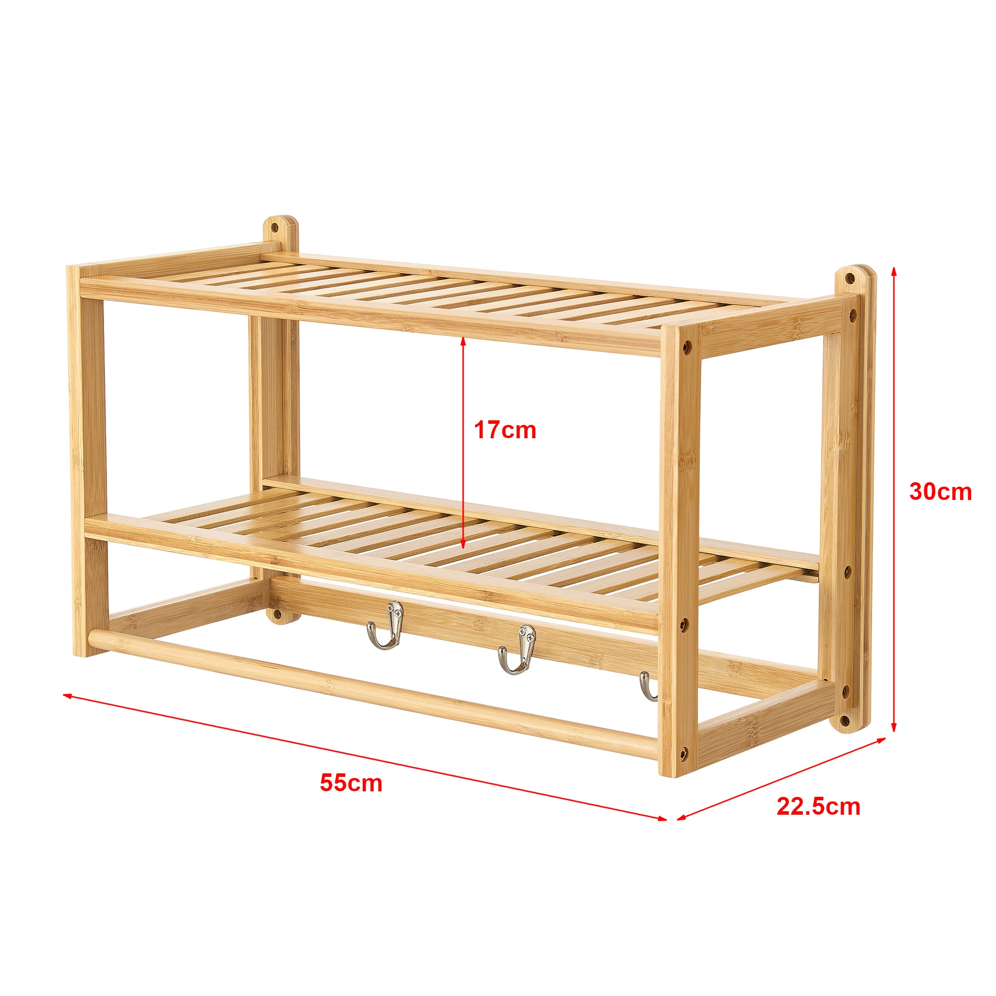 Ponadto, zrównoważona bambusowa konstrukcja oferuje trzy haczyki, na których można powiesić kurtki, szlafroki, ręczniki i wiele innych przedmiotów. Oznacza to, że najważniejsze przedmioty są zawsze pod ręką.