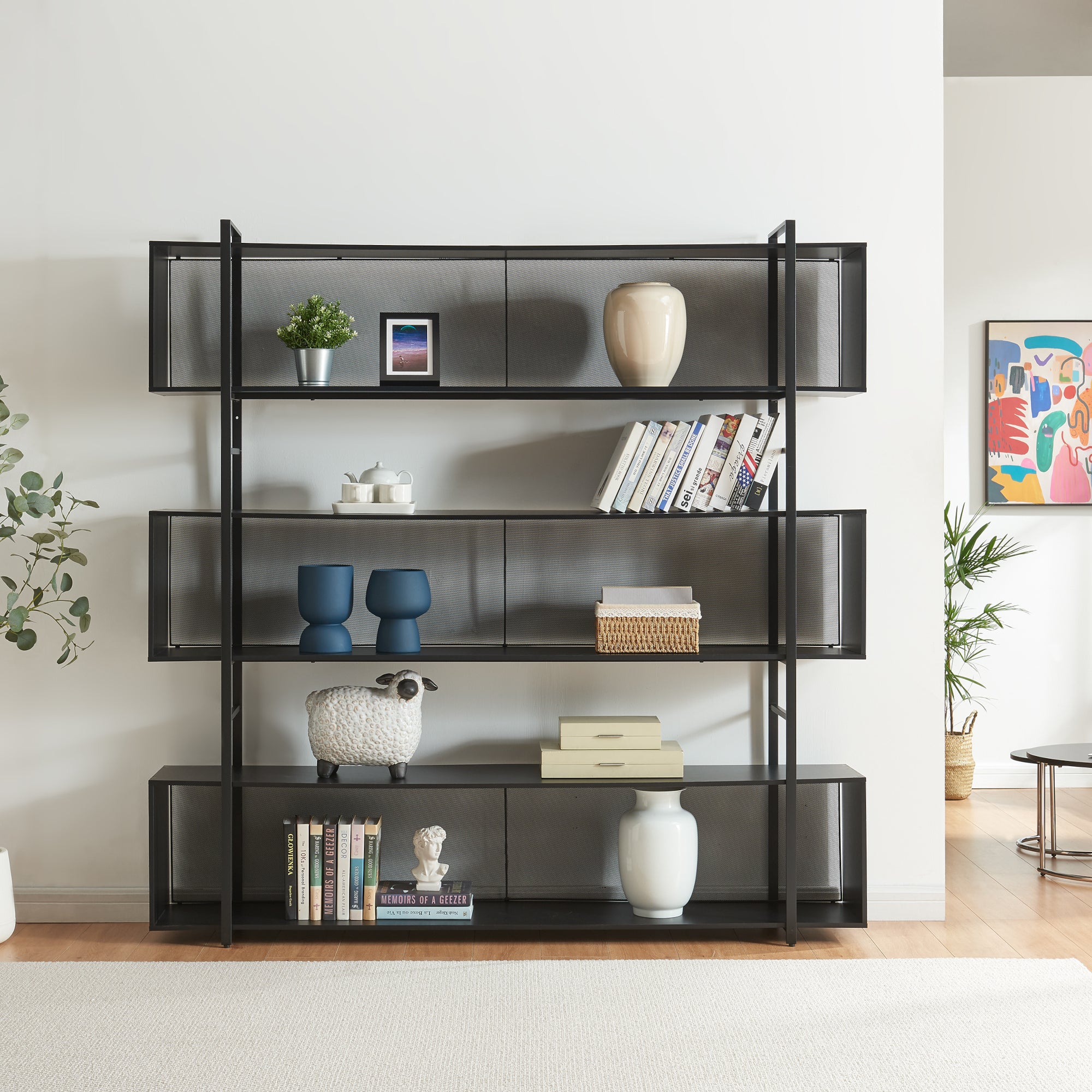 Trzy otwarte przedziały regału stojącego na podłodze i przestrzenie pomiędzy nimi oferują mnóstwo miejsca do przechowywania książek, roślin i innych osobistych skarbów. Ta otwarta konstrukcja oznacza, że ulubione przedmioty są zawsze w zasięgu ręki i jednocześnie atrakcyjnie zaprezentowane.