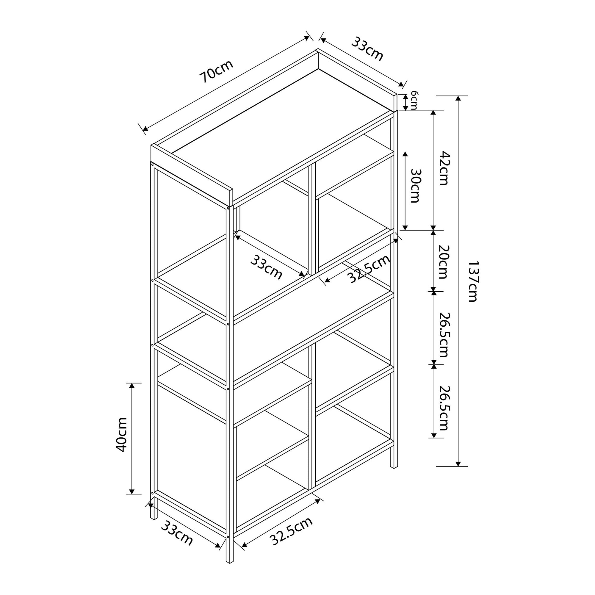 Liczne otwarte półki i dodatkowa górna półka zapewniają mnóstwo miejsca na książki, rośliny i akcesoria dekoracyjne. Otwarta konstrukcja sprawia, że ulubione przedmioty są zawsze na widoku i jednocześnie stylowo wyeksponowane.
