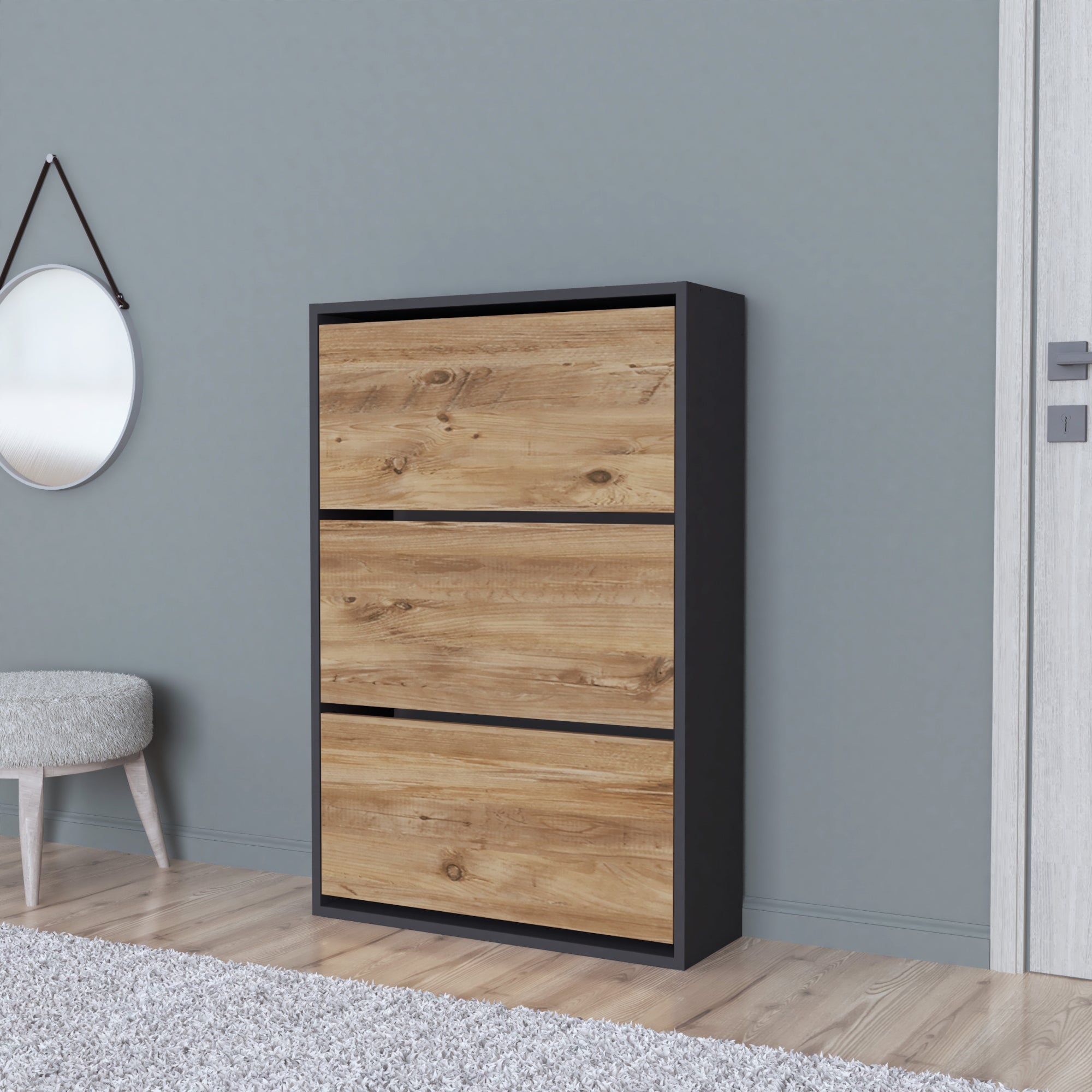 Nowoczesna szafka na buty z trzema uchylnymi drzwiczkami to idealne rozwiązanie do przechowywania obuwia w sposób oszczędzający miejsce. Jej atrakcyjny design sprawia, że przyciąga wzrok w każdym pomieszczeniu.