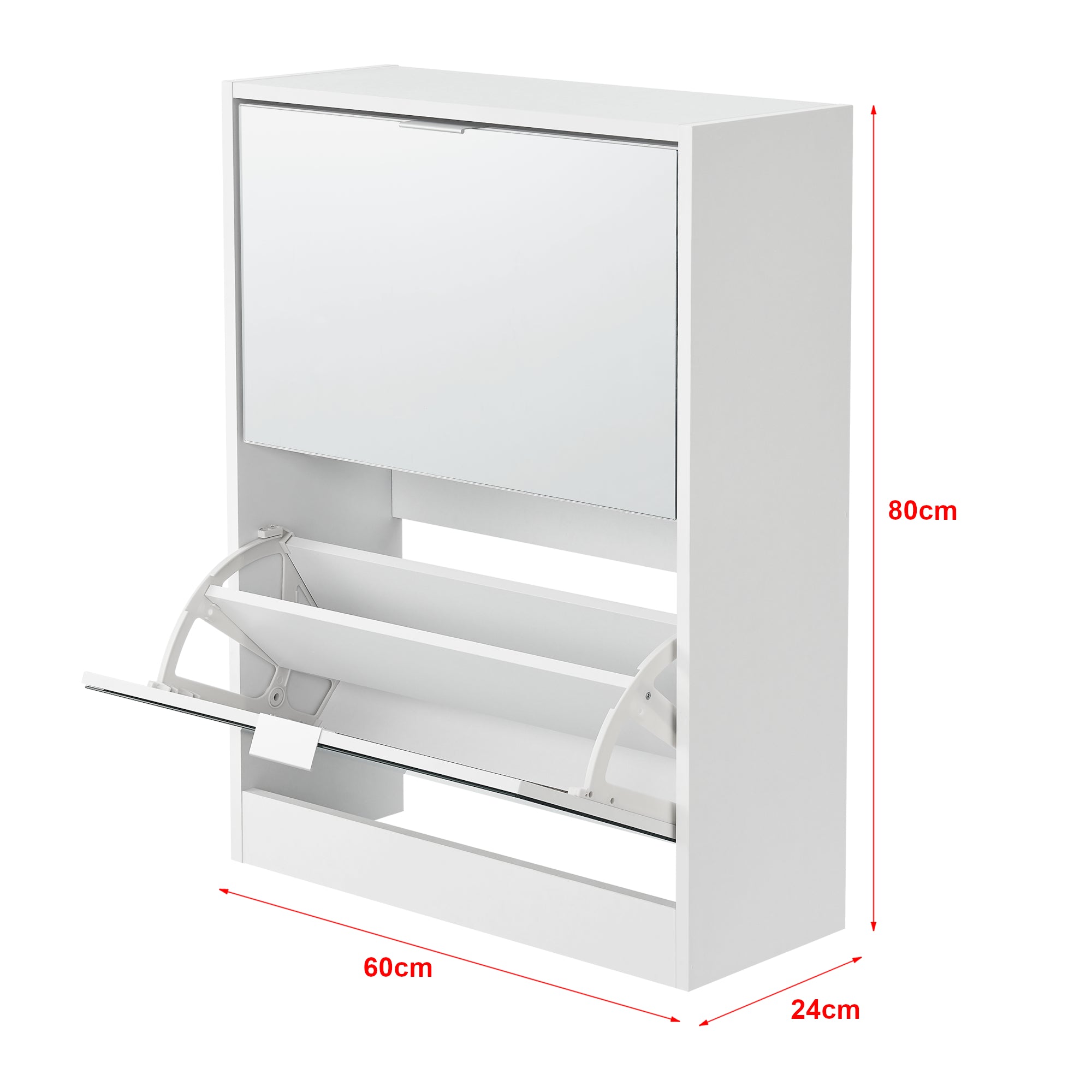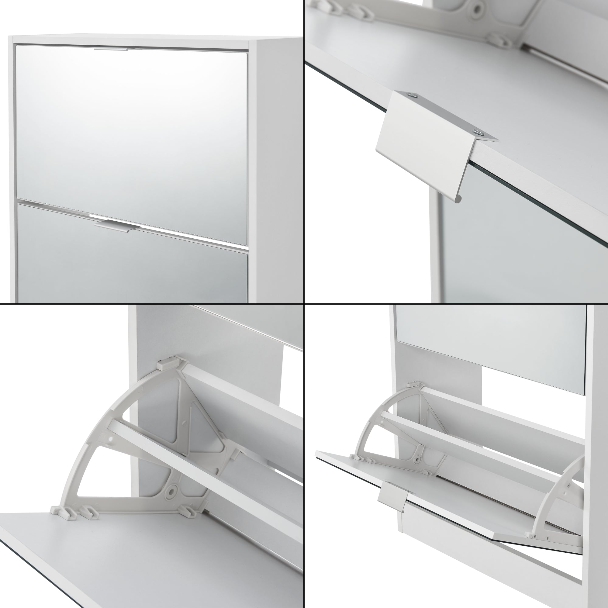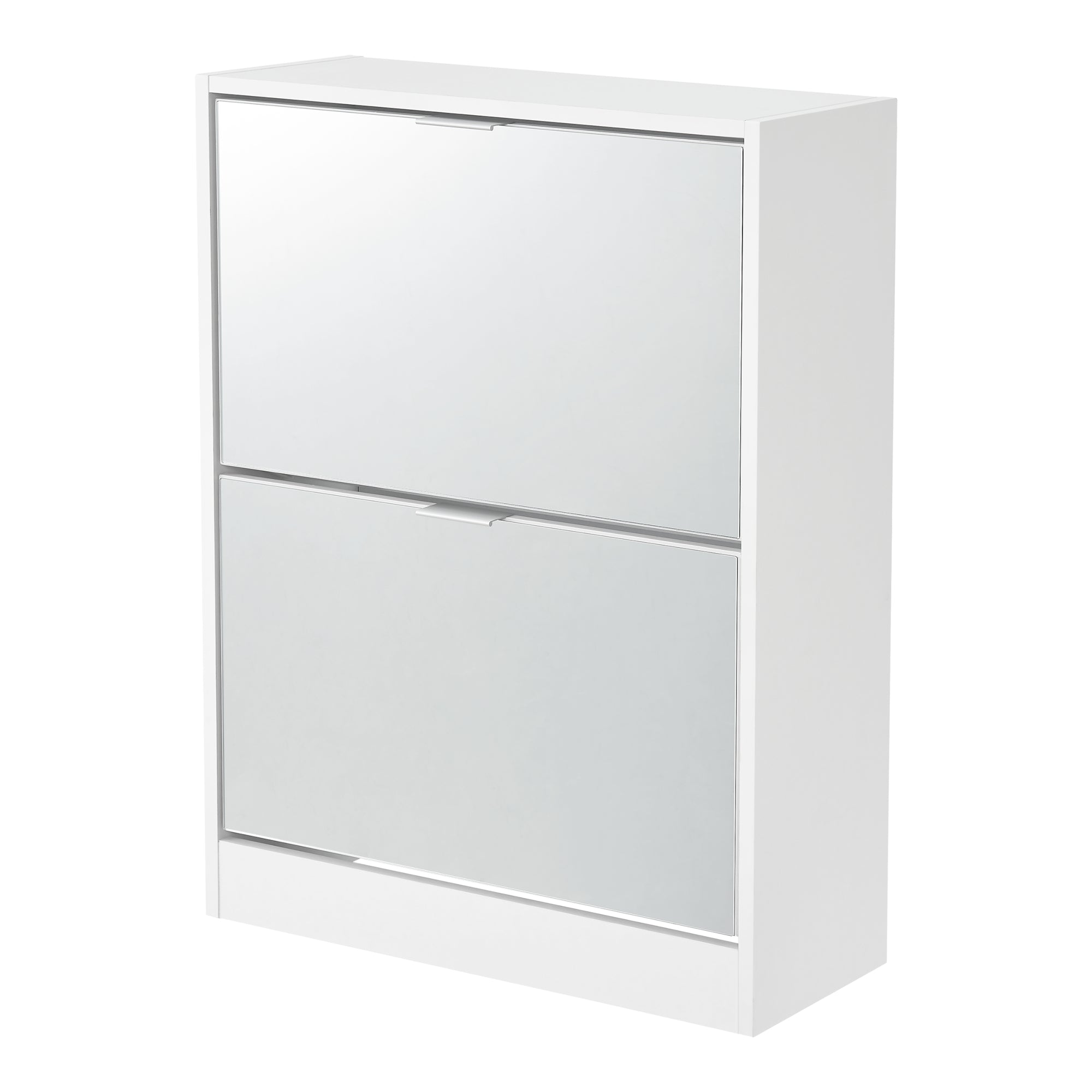 Szafka na buty ma dwoje drzwi na zawiasach z lustrzanym frontem. Ta lustrzana powierzchnia nadaje szafce odrobinę wyrafinowania i optycznie powiększa pomieszczenie. Jednocześnie pozwala na ostatnie spojrzenie na swój strój podczas wybierania butów.