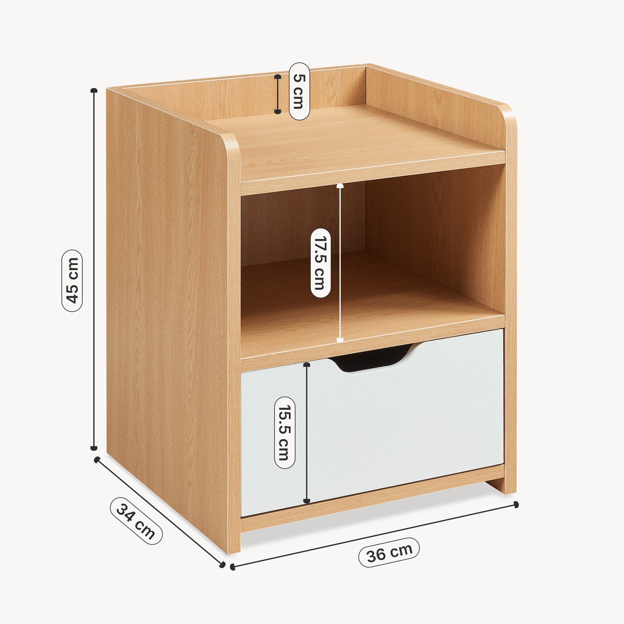 Dzięki kompaktowym rozmiarom stolik nocny idealnie mieści się obok łóżka. Solidny blat oferuje wystarczająco dużo miejsca na lampkę, smartfon, filiżankę herbaty lub inne przedmioty, które chcesz mieć pod ręką. Podwyższony brzeg z boków i z tyłu zapobiega przypadkowemu zsunięciu się rzeczy.