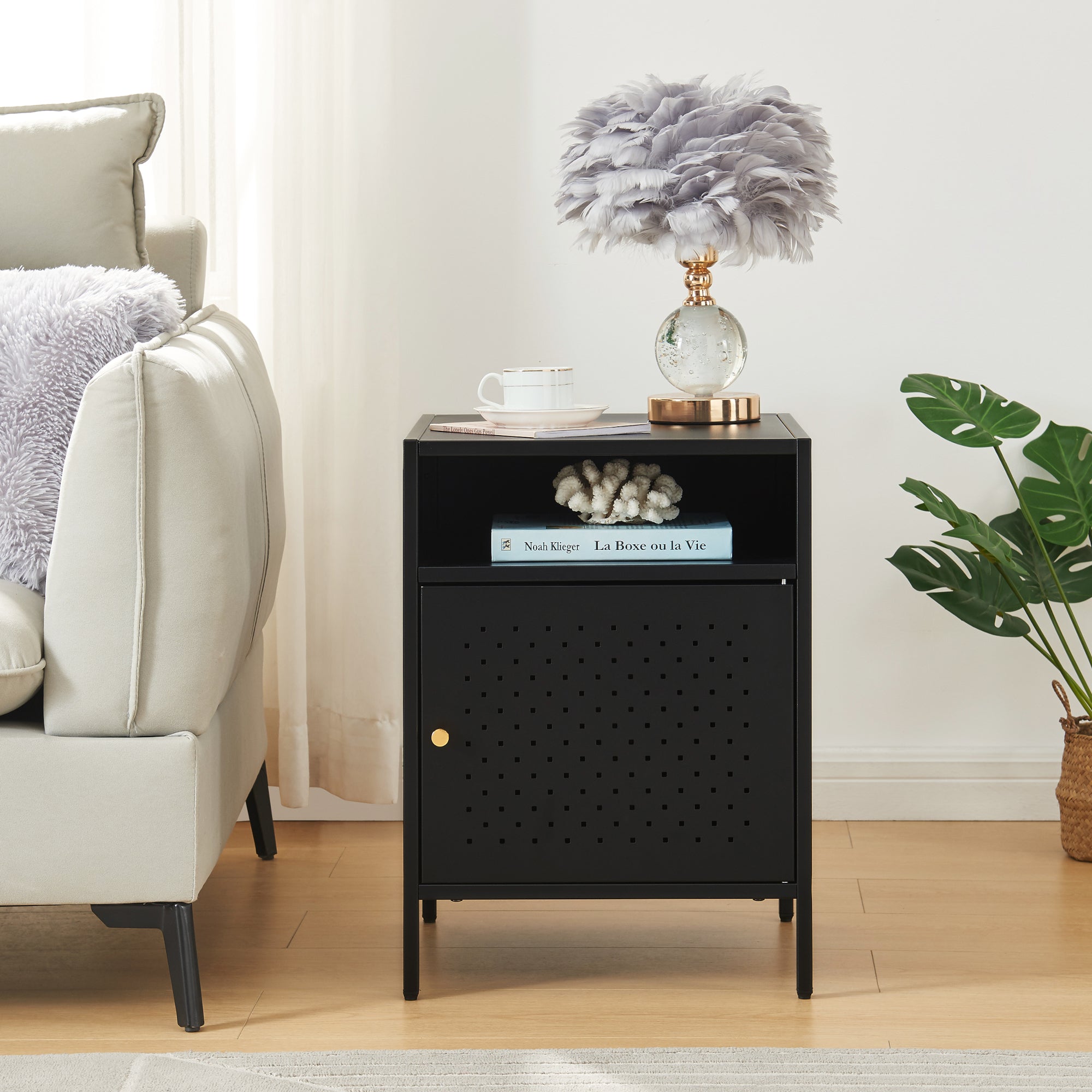 Szafka nocna to stylowy i praktyczny mebel, który będzie doskonałym dodatkiem do sypialni. Dzięki przepuszczającym powietrze drzwiczkom szafki i otwartemu schowkowi, ta szafka nocna jest idealna do przechowywania rzeczy osobistych w bezpiecznym i uporządkowanym miejscu.