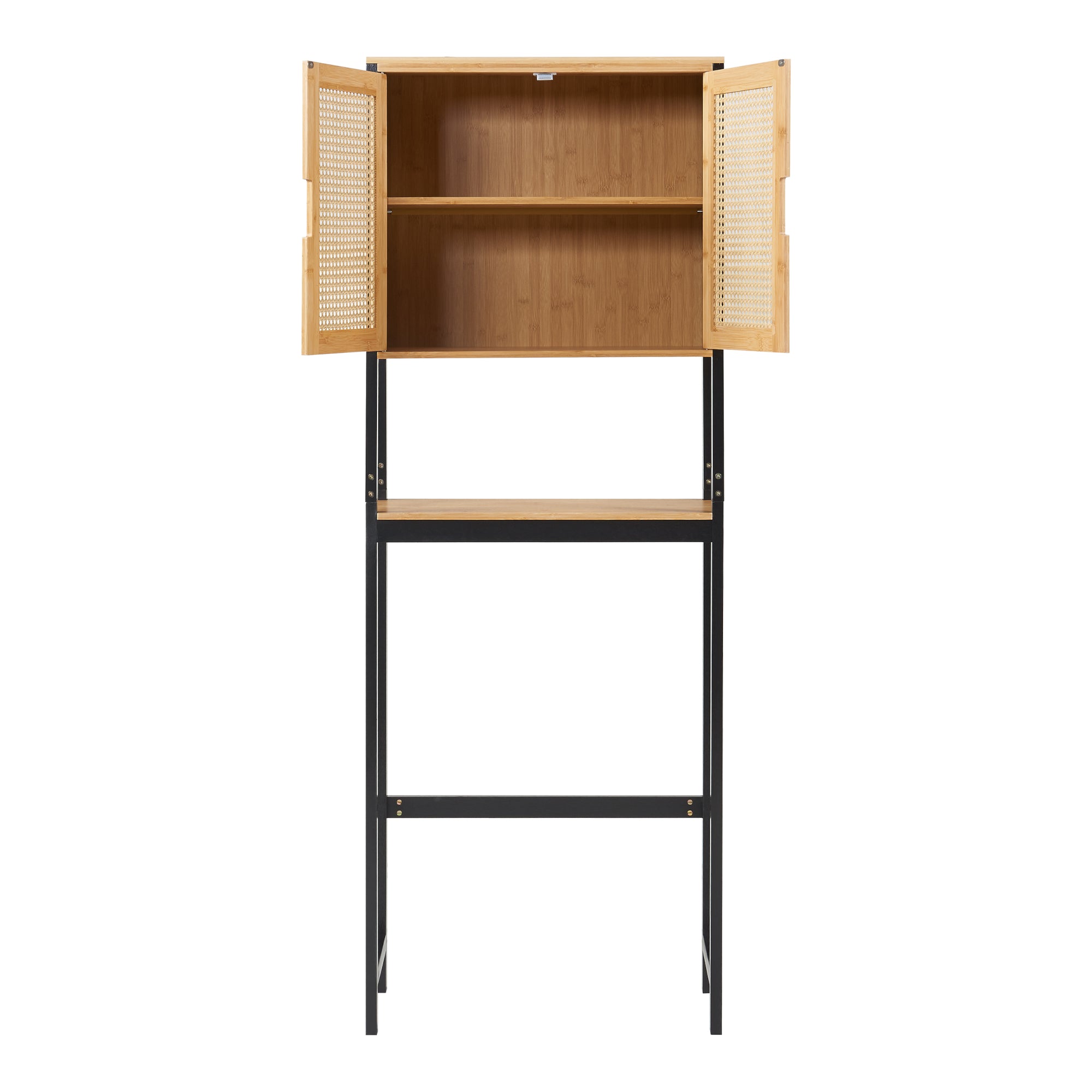Szafka ma dwoje drzwiczek, dzięki czemu można ją otwierać i zamykać bez wysiłku, zapewniając łatwy dostęp do przyborów łazienkowych. Dolny, otwarty schowek oferuje kolejną opcję przechowywania wszystkich przedmiotów, takich jak ręczniki, papier toaletowy lub środki czyszczące.