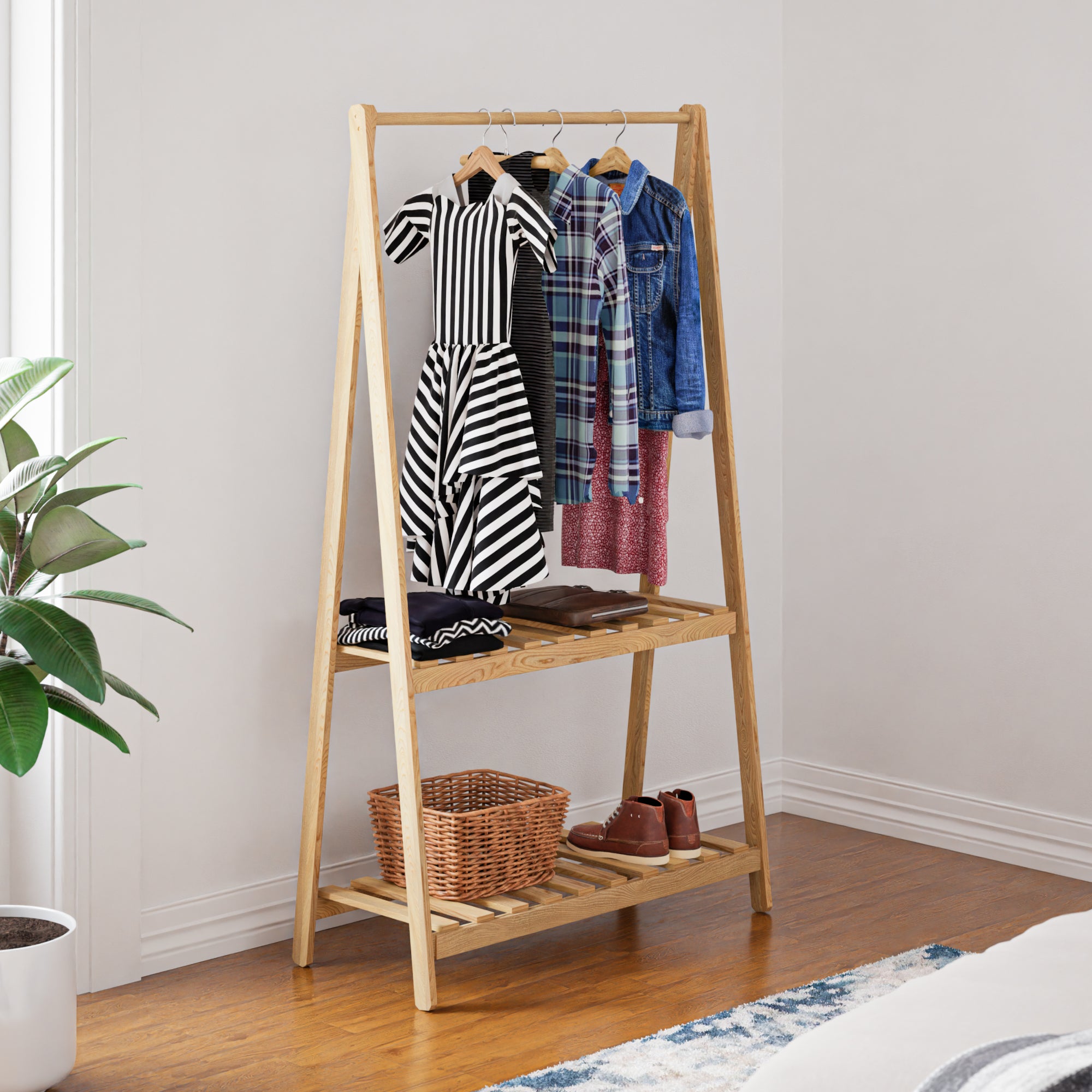Ten praktyczny i solidny wieszak na ubrania wykonany z naturalnego drewna sosnowego jest szybki i łatwy w montażu. Posiada drążek na ubrania i pozwala mieć ulubione rzeczy zawsze pod ręką. Dwie półki oferują idealne miejsce na przykład na buty lub torby.