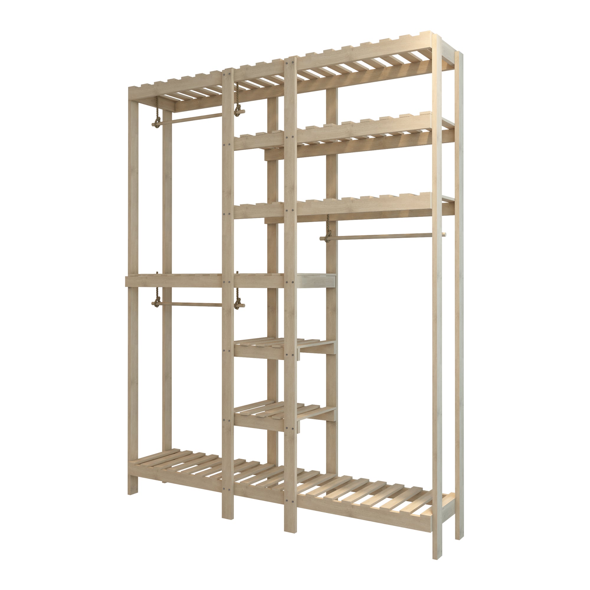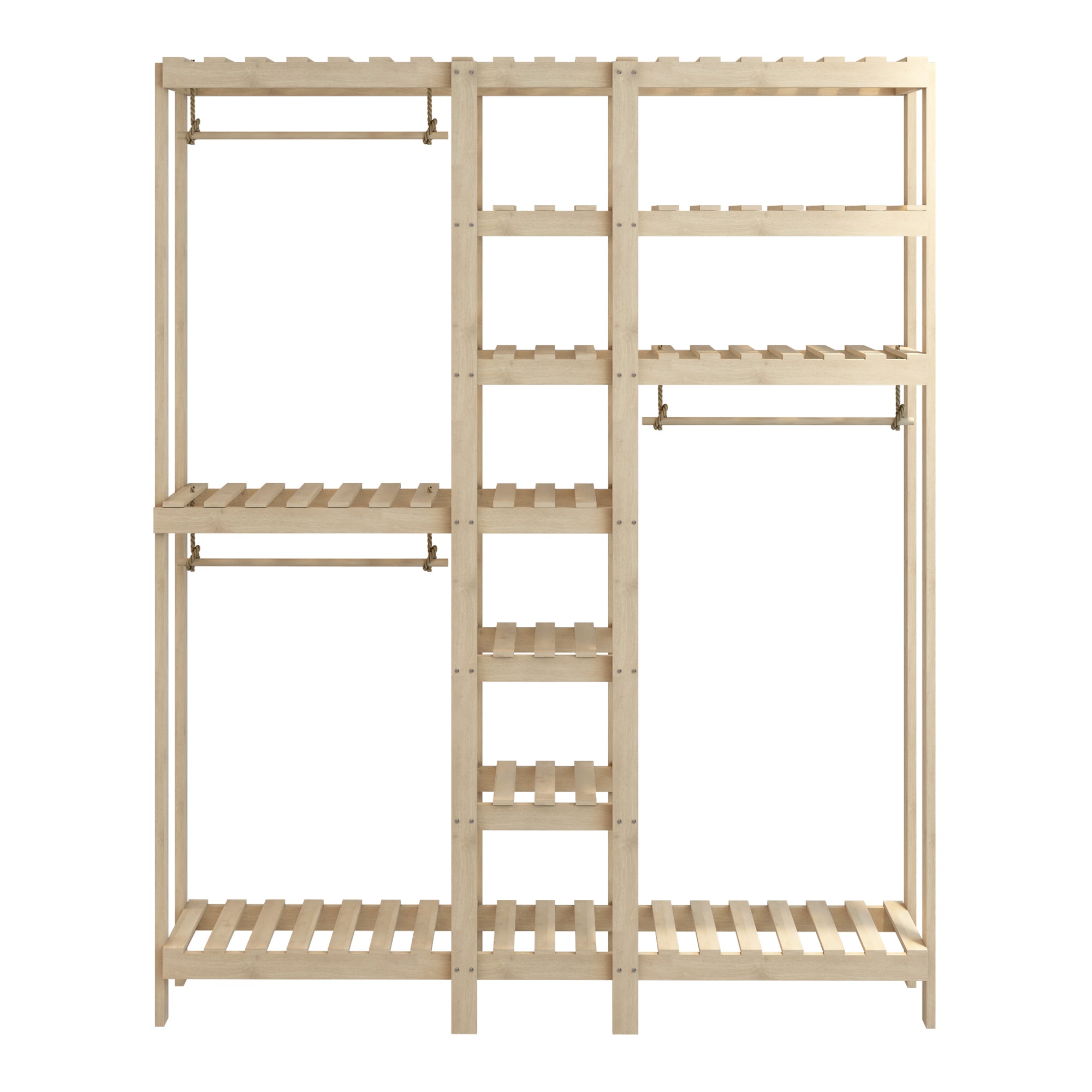 Ten praktyczny i solidny wieszak na ubrania wykonany z naturalnego drewna sosnowego jest szybki i łatwy w montażu. Posiada trzy drążki na ubrania, sześć małych półek na środku na koszulki lub ręczniki oraz dwie duże półki w prawym górnym rogu na wszystkie przedmioty. Dwie duże dolne półki są idealne na przykład na buty, a górna półka może służyć jako wieszak na kapelusze.