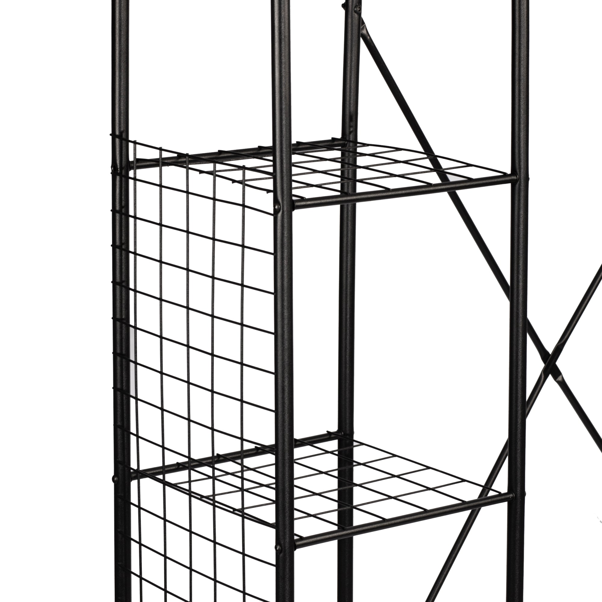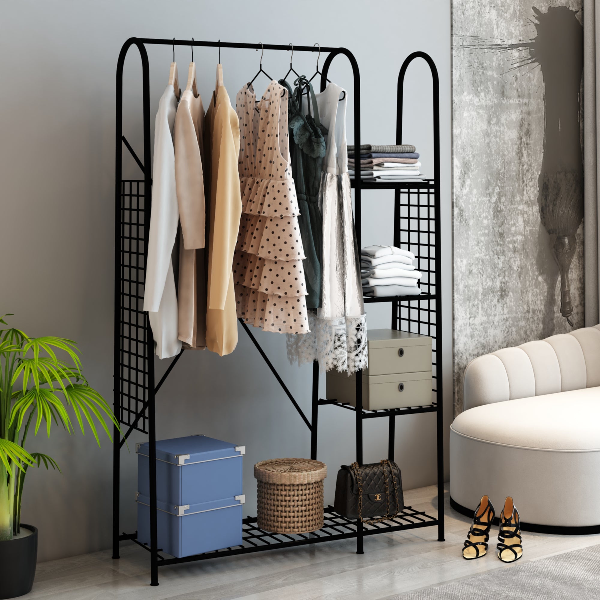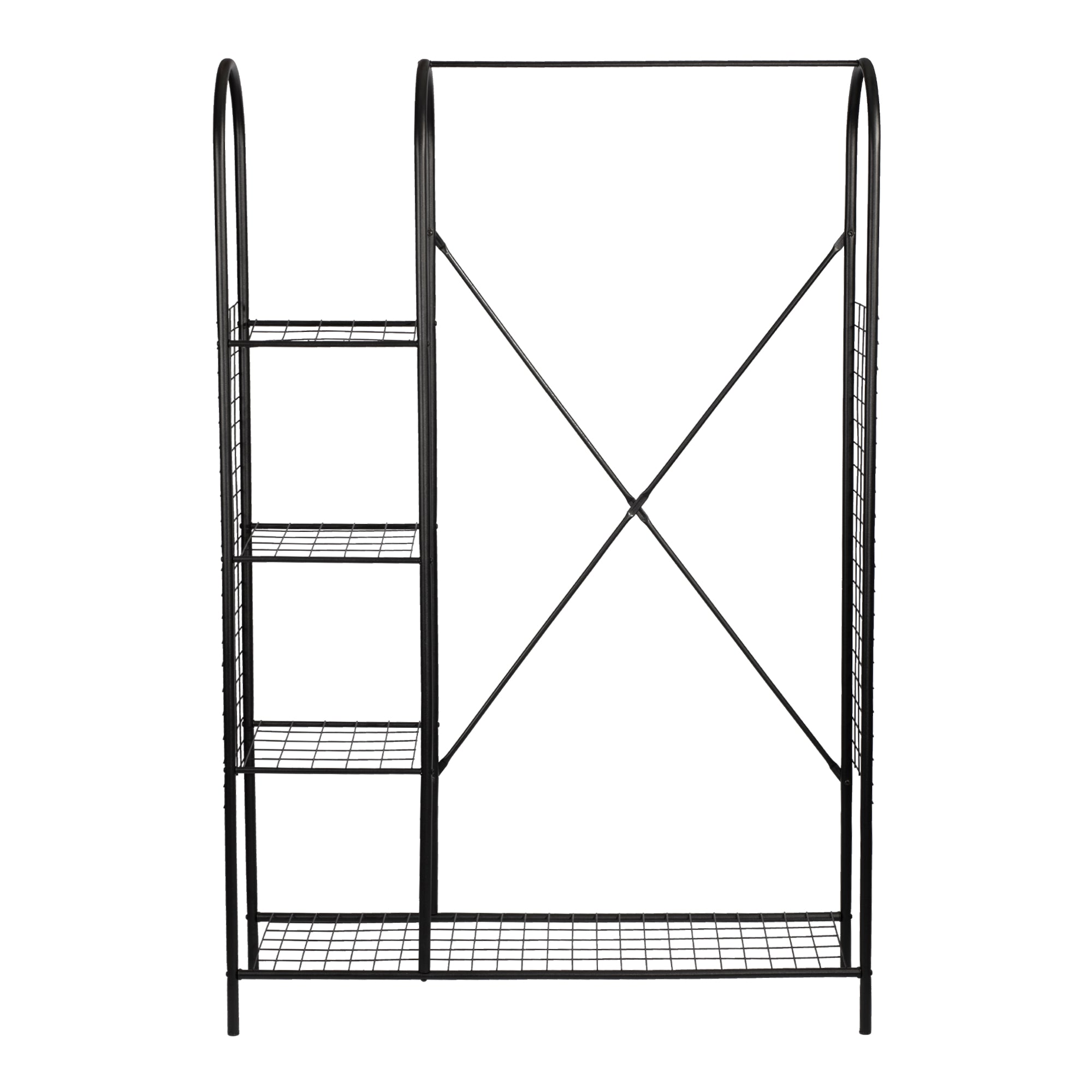 Ten praktyczny i wytrzymały wieszak na ubrania jest szybki i łatwy w montażu. Posiada drążek na ubrania i łącznie cztery półki na wszystkie przedmioty. Duża, dolna półka jest idealna na przykład na buty, podczas gdy trzy mniejsze półki są idealne między innymi na koszulki, czapki lub ręczniki.