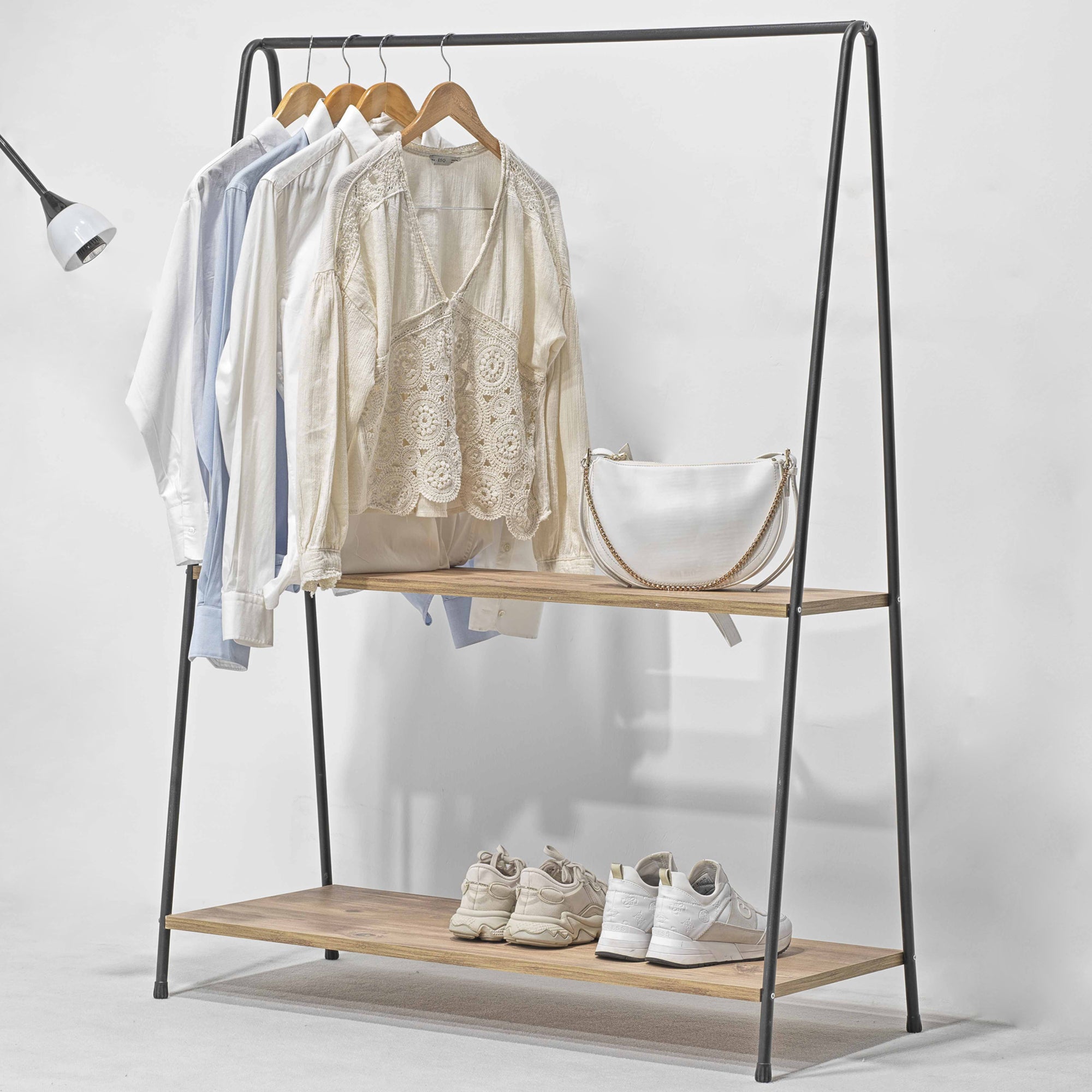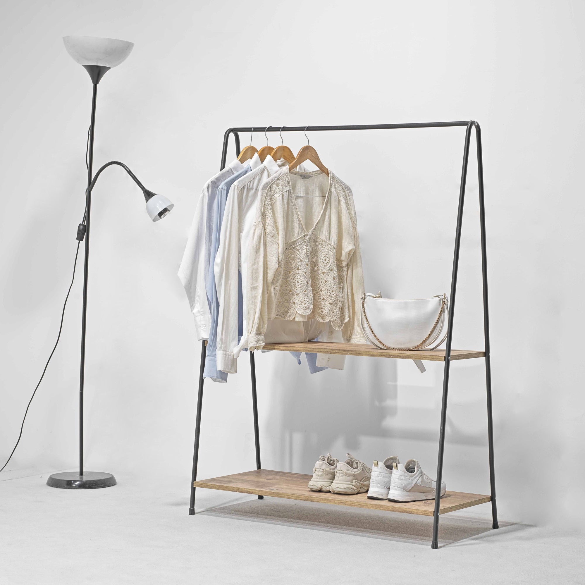 Ten praktyczny i wytrzymały wieszak na ubrania jest szybki i łatwy w montażu. Posiada drążek do wieszania ubrań i 2 półki na przykład na torebki lub buty.