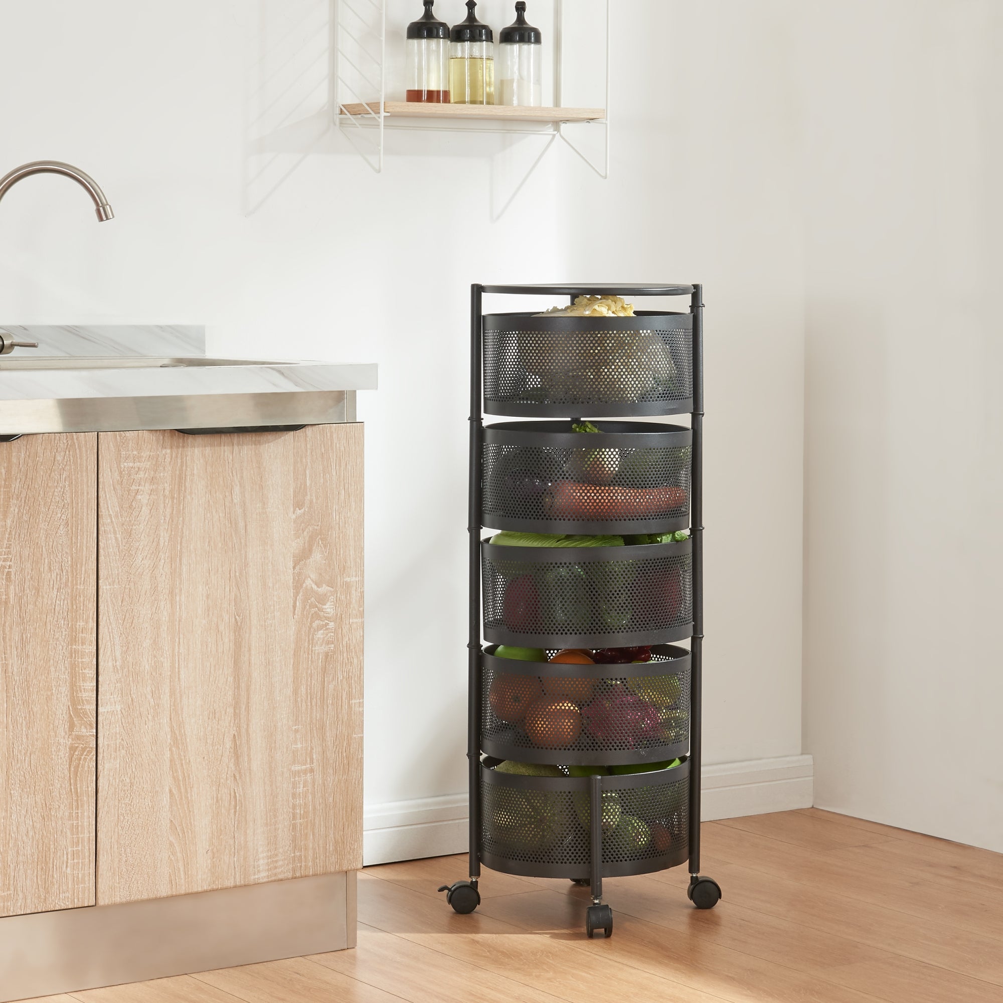 Trzy/cztery/pięć okrągłych koszy do przechowywania zapewnia dużo miejsca na naczynia, napoje, przekąski lub inne przedmioty, które chcesz mieć pod ręką. Dzięki czterem rozkładanym górnym koszom można nie tylko łatwo dotrzeć do wszystkich przedmiotów, ale także szybko i wygodnie je przechowywać.