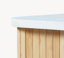Blat stołu oferuje dużo miejsca na rośliny, zdjęcia i dekoracje, podczas gdy wewnątrz stołu znajdują się dwie półki, które można otwierać i ukrywać za pomocą drzwi przesuwnych. Te półki zapewniają dodatkową przestrzeń do przechowywania książek, kluczy i innych osobistych drobiazgów.