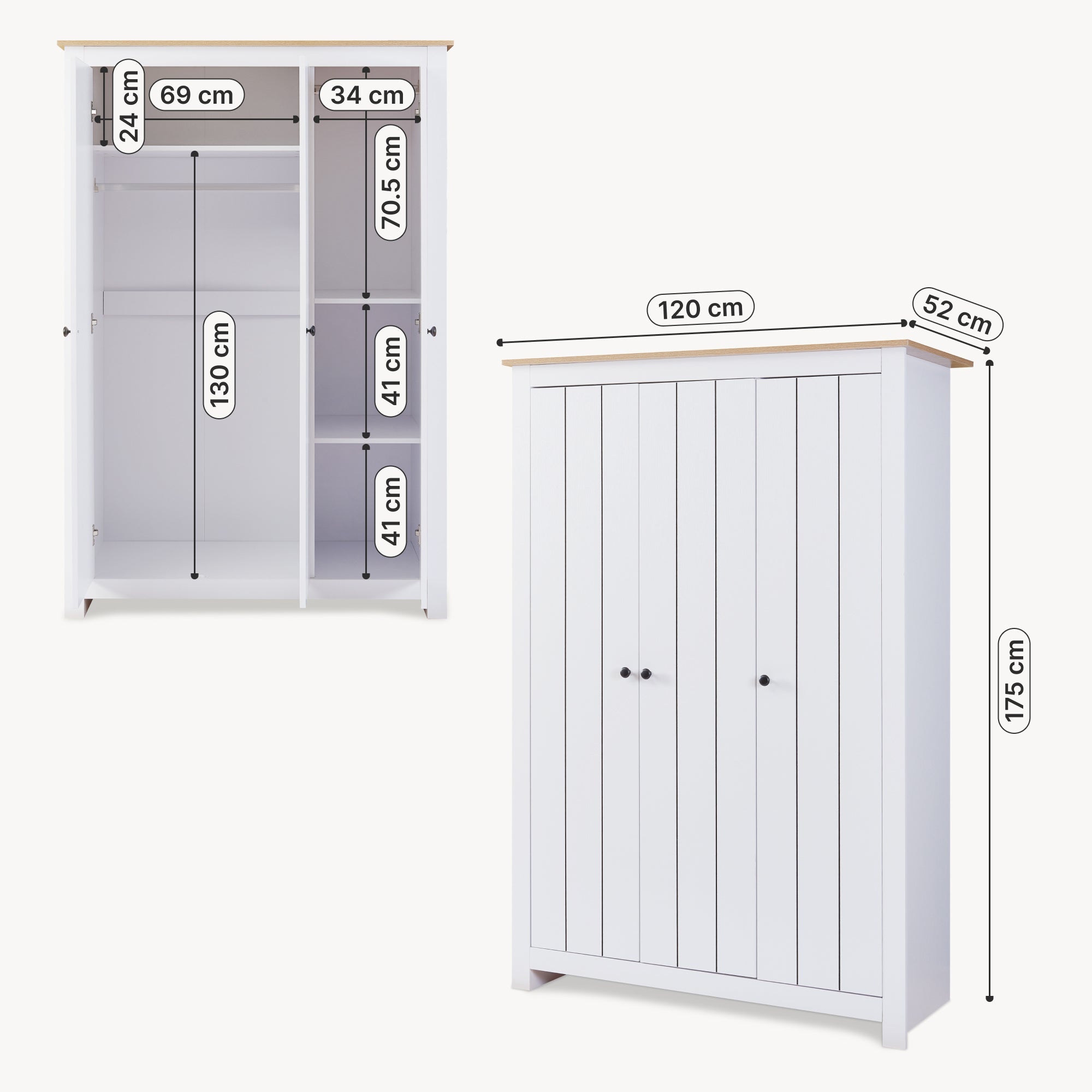 Wewnątrz szafy za dwoma drzwiami znajduje się duża przestrzeń do wieszania z drążkiem na ubrania oraz obszerna półka w górnej części. Za trzecimi drzwiami znajduje się dodatkowa, mniejsza przestrzeń do wieszania z krótszym drążkiem oraz dwie półki poniżej.