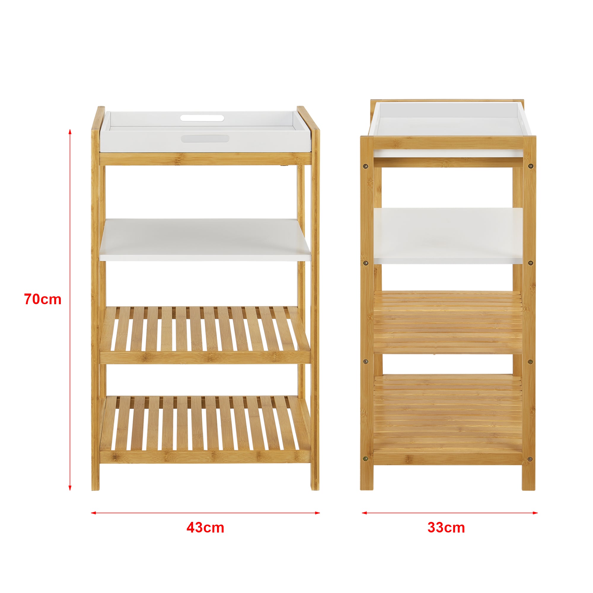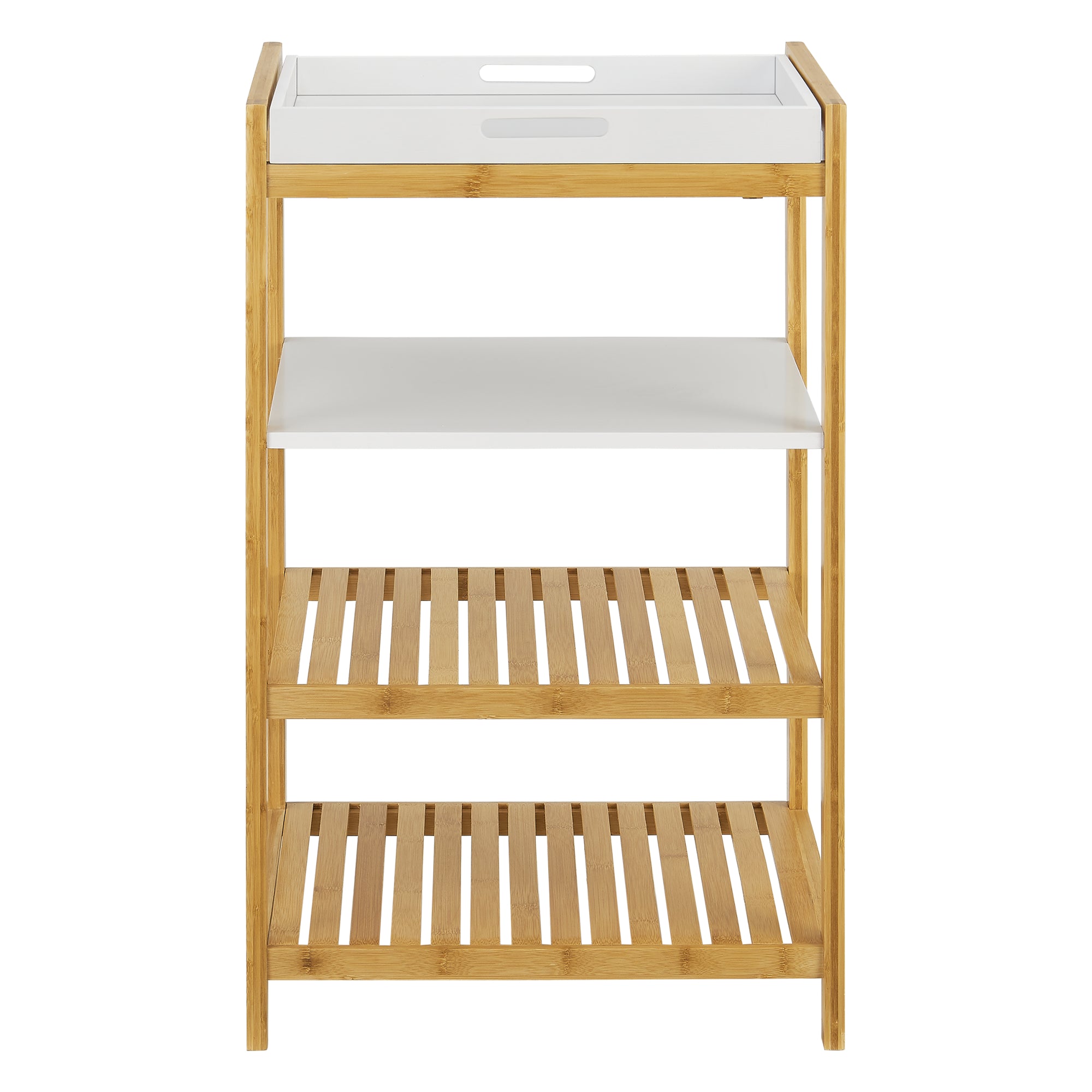 Wolnostojący i praktyczny regał stojący jest idealny do Twojego salonu. Niezależnie od tego, czy w łazience, kuchni czy salonie, można go używać wszędzie. Dolne półki dają możliwość oszczędnego przechowywania wszelkich przedmiotów. Ponadto posiada dodatkową tacę, którą można zdjąć i która np. idealnie nadaje się do serwowania przekąsek lub potraw.