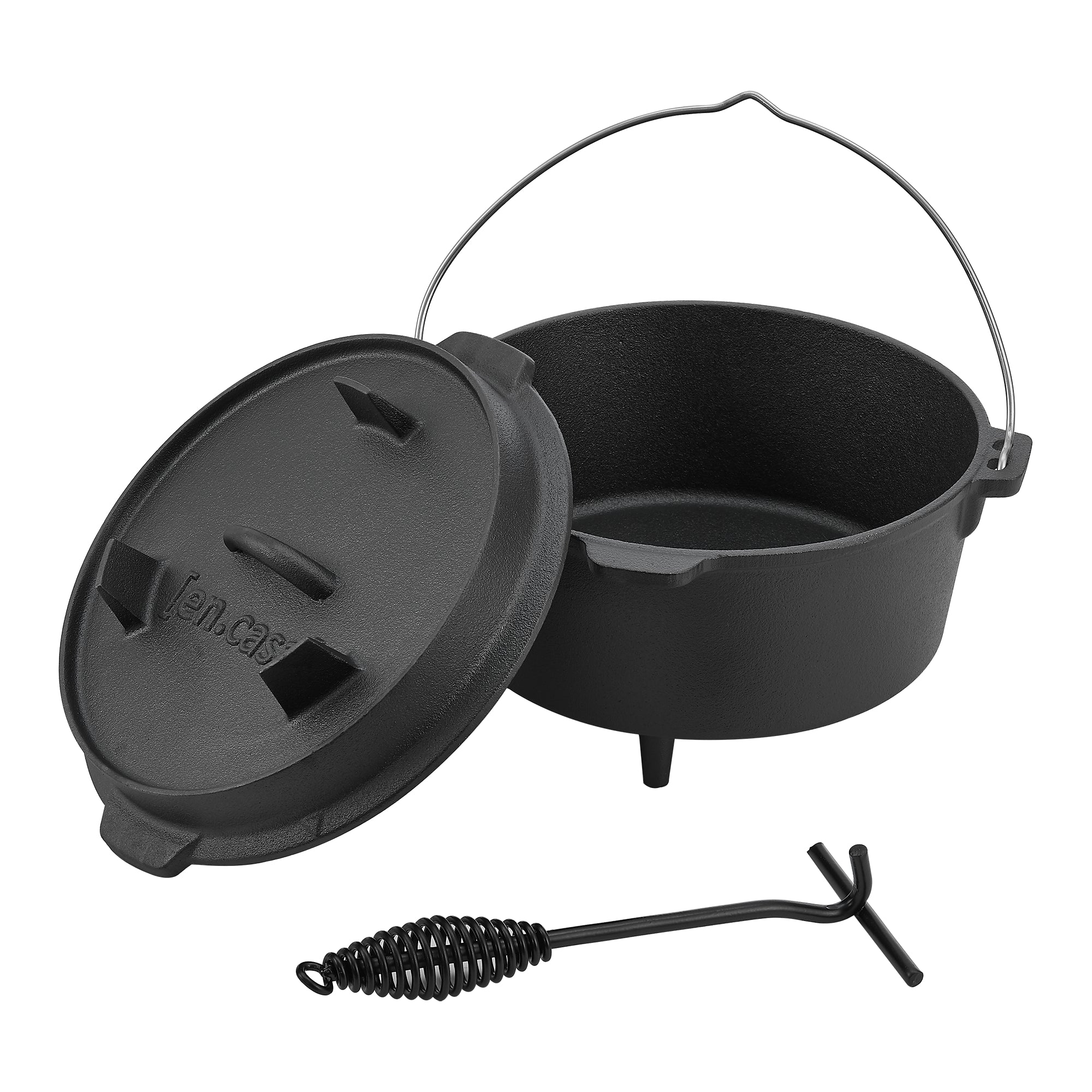 Garnek żeliwny to wszechstronny talent, który można wykorzystać np. jako garnek do duszenia, kociołek do gulaszu lub garnek do pieczenia chleba. Żar, rozżarzone węgle lub brykiety grillowe można umieścić bezpośrednio na pokrywie lub pod garnkiem. Dutch Oven umożliwia równomierne gotowanie i posiada podnośnik do pokrywy.
