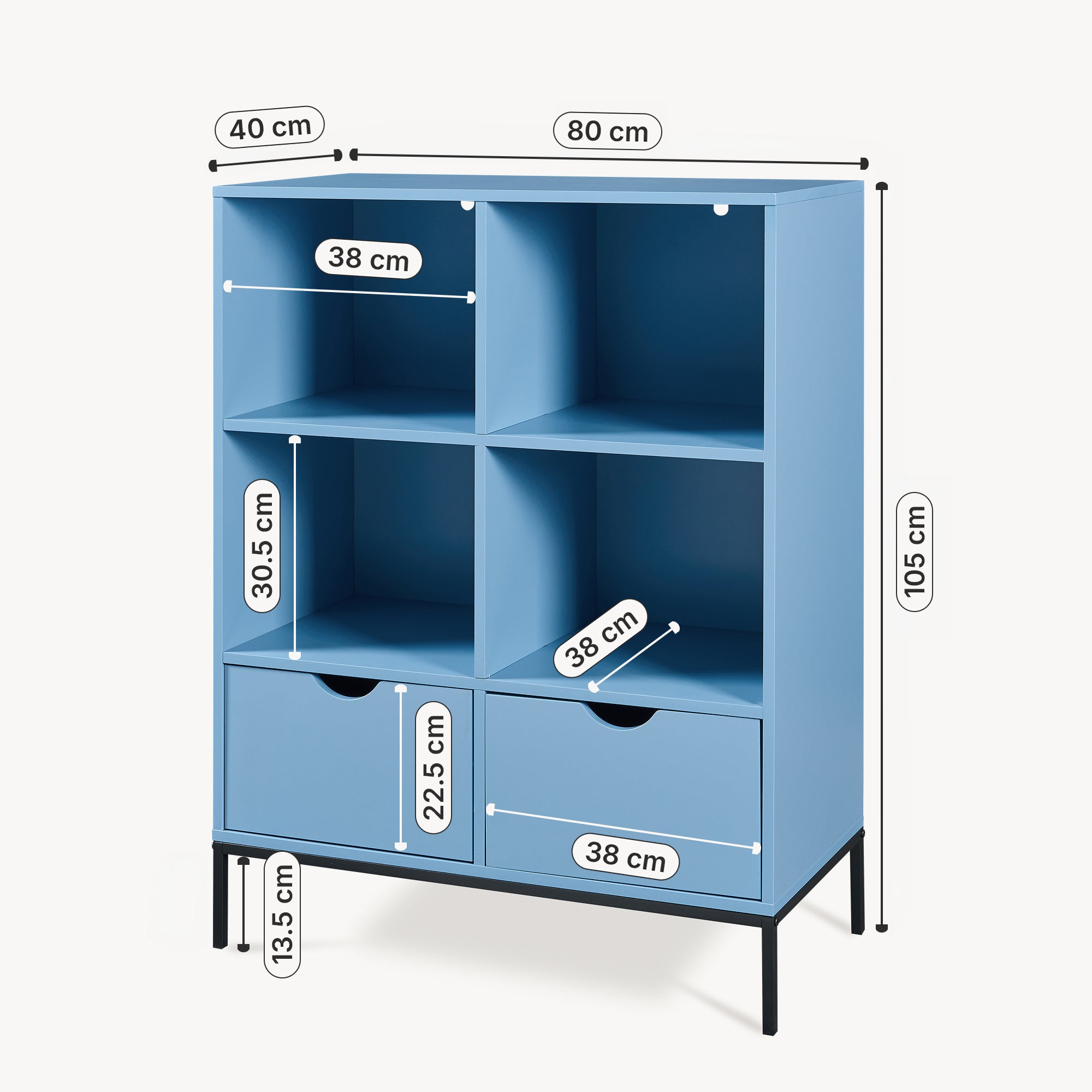 Cztery otwarte półki tworzą przejrzyste powierzchnie do przechowywania książek, dekoracji i roślin, podczas gdy dwie szuflady schludnie chowają akcesoria, dokumenty lub kable. Dzięki temu masz swoje ulubione przedmioty zawsze pod ręką i tworzysz spójną całość.