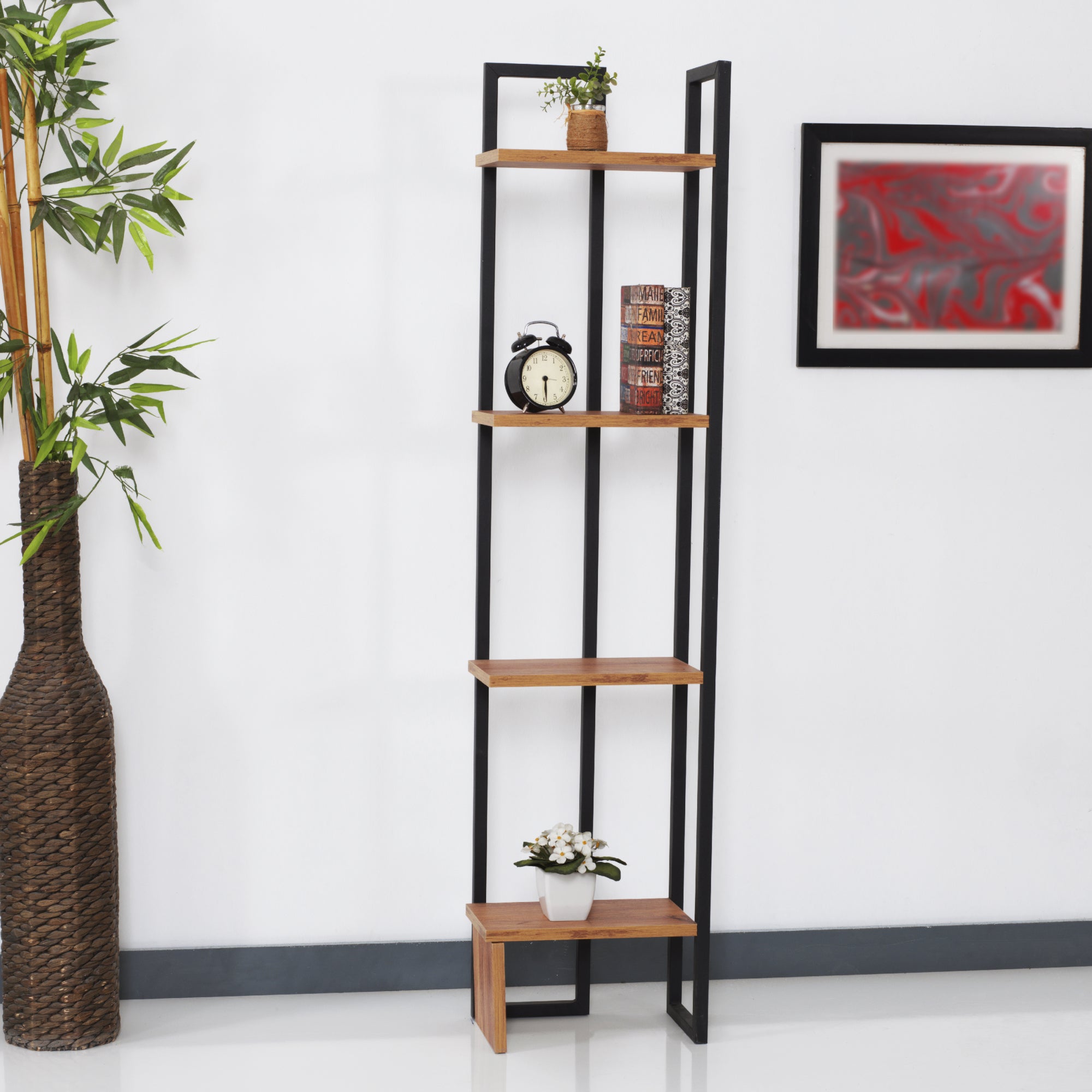 Ten stylowy i praktyczny regał stojący posiada łącznie 4 półki. Idealnie nadaje się do każdego pomieszczenia mieszkalnego do przechowywania wszelkich przedmiotów.