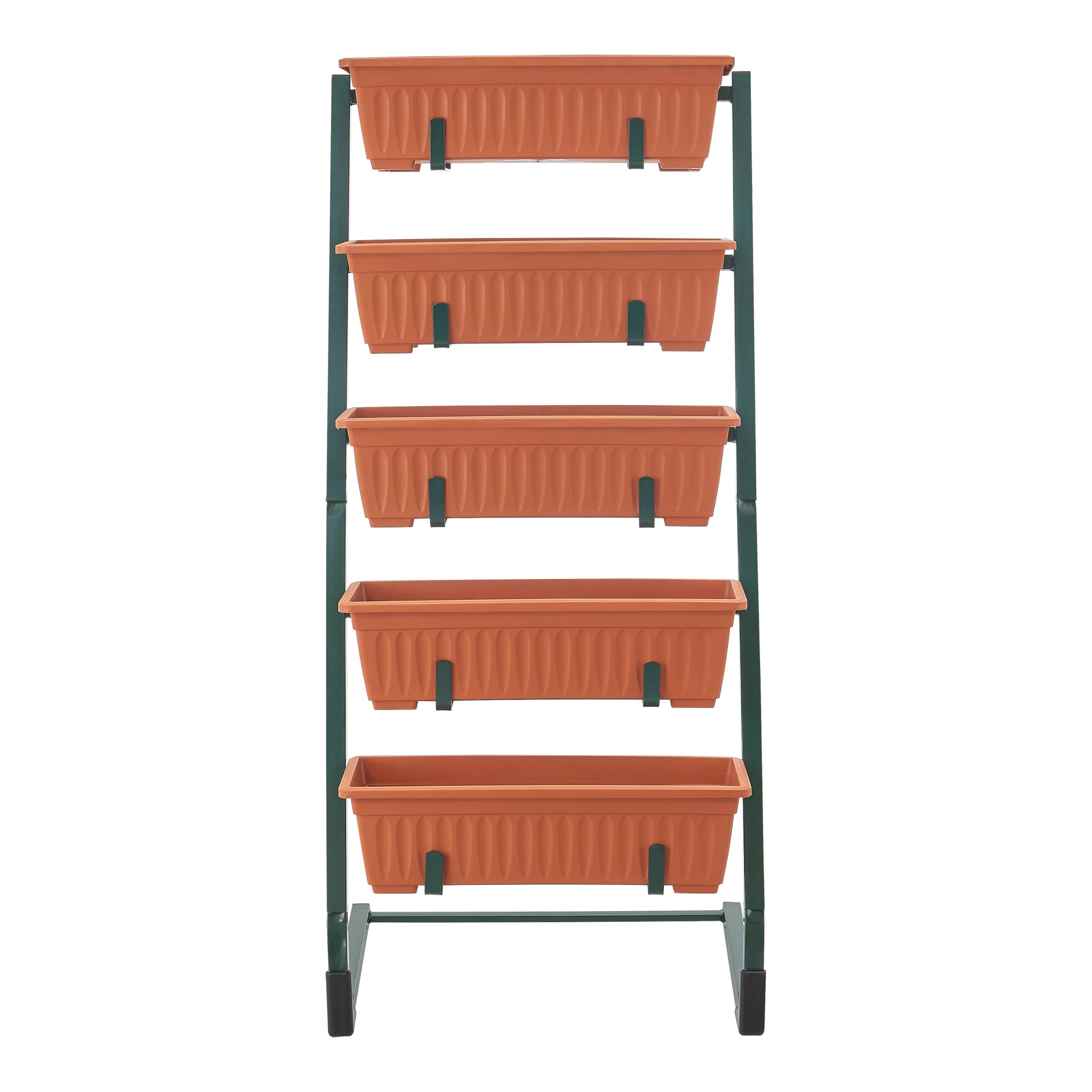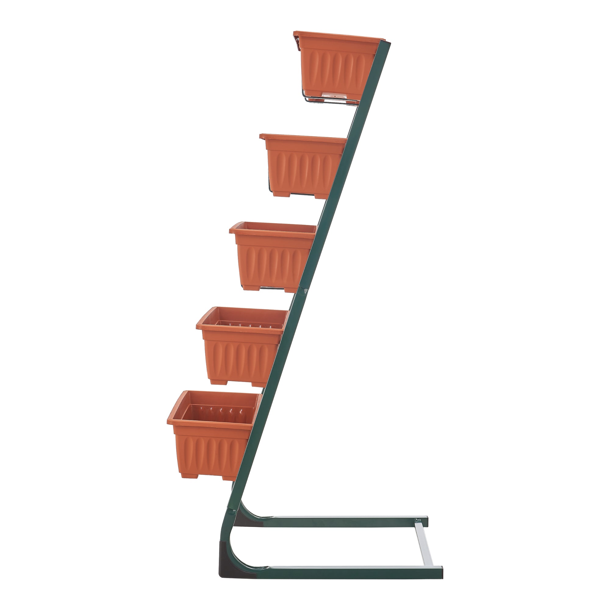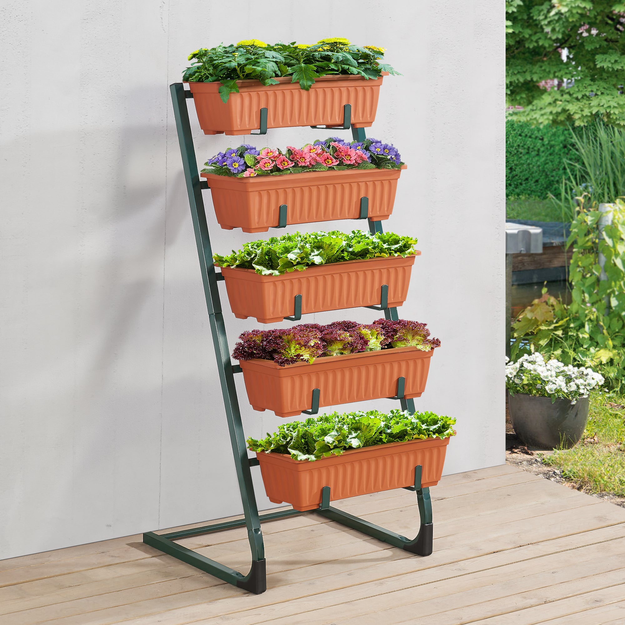 Oszczędzające miejsce schody na rośliny posiadają pięć doniczek. Drabinkowe ułożenie doniczek umożliwia wiele zastosowań na małej powierzchni.