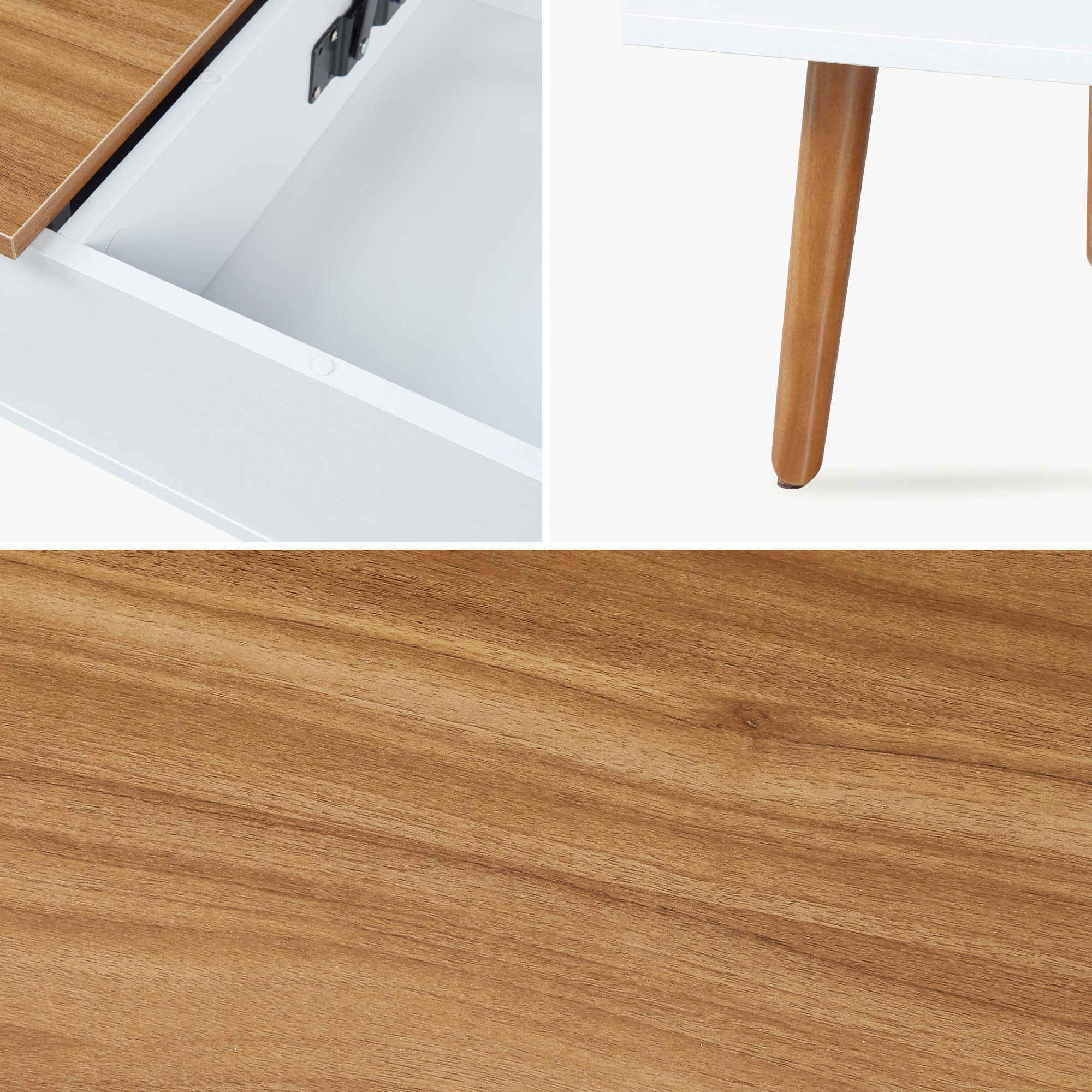 Przestronny, dwuczęściowy blat oferuje dużo miejsca na książki, czasopisma, przekąski, napoje lub piloty, utrzymując wszystko wygodnie w zasięgu ręki. Wewnątrz znajdują się dwie oddzielne przegrody, w których Twoje osobiste przedmioty są schludnie przechowywane. Mniejsza część blatu jest wysuwana, podczas gdy większa otwierana za pomocą mechanizmu podnoszącego, dzięki czemu obie przegrody pozostają szybko dostępne.