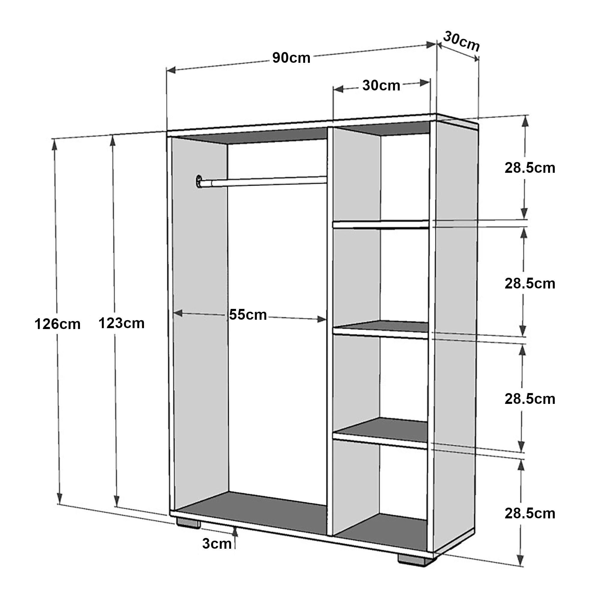 Szafa wyposażona jest w drążek na ubrania, idealny na kurtki, płaszcze i koszule. Ponadto cztery otwarte schowki oferują dodatkowe miejsce do przechowywania, które można wykorzystać na przykład na buty, torby lub plecaki. Pozwala to na zorganizowane i schludne przechowywanie.
